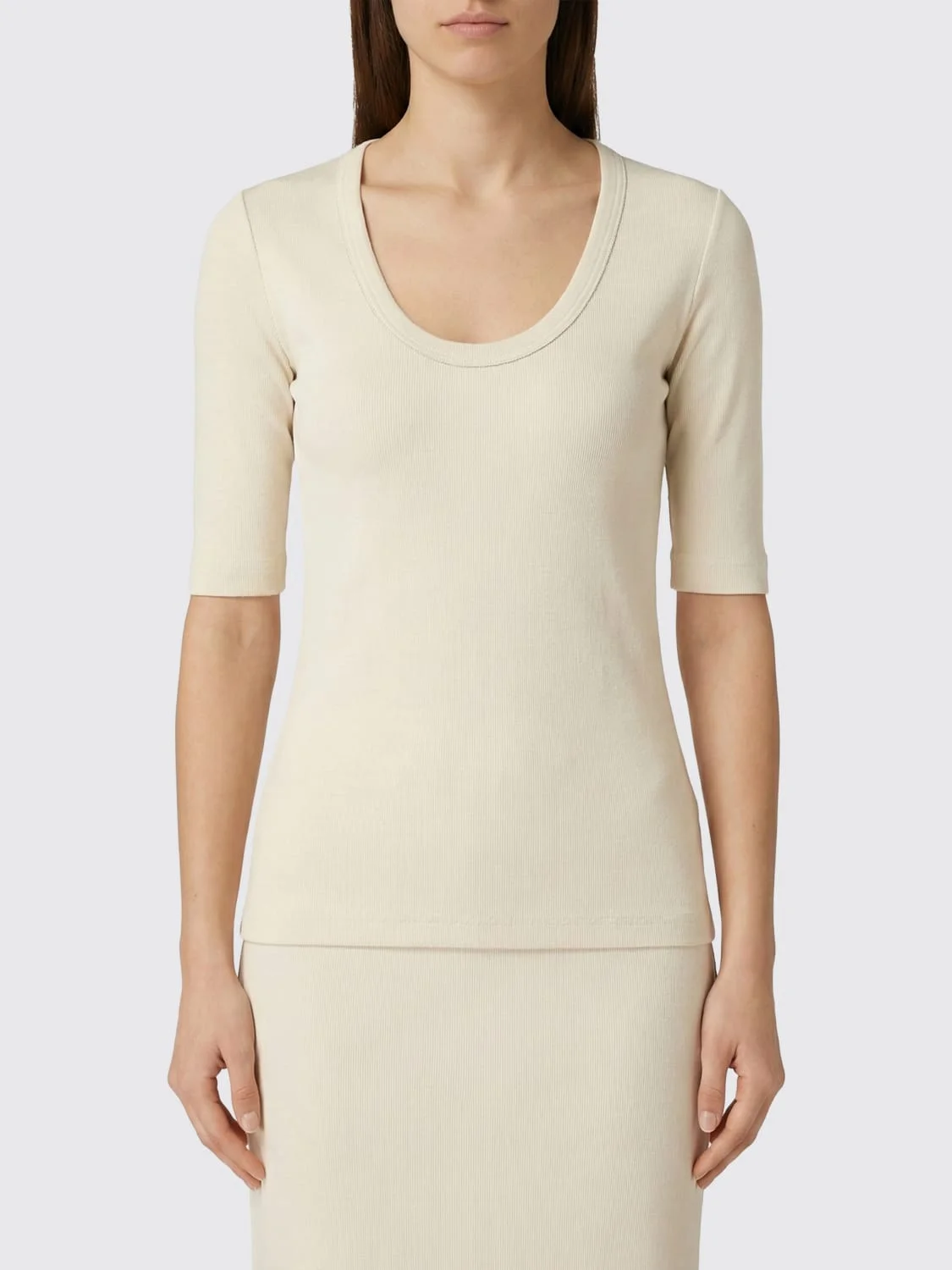 DESCRIPTION - Style: Basic, Casual - Neckline: U neckline - Shoulders: Regular - Sleeves: Short - Bottom: With straight hemline - Materials: Cotton - Pattern: Plain-colored DETAILS AND CARE Composition COTTON SIZE AND FIT Sizes not available Size and fit Slim fit Designer code: JED266F603L896 0145 Giglio Code: H85335 Designer: Fabiana Filippi Collection: Fabiana Filippi Woman Category: Clothing Fabiana Filippi