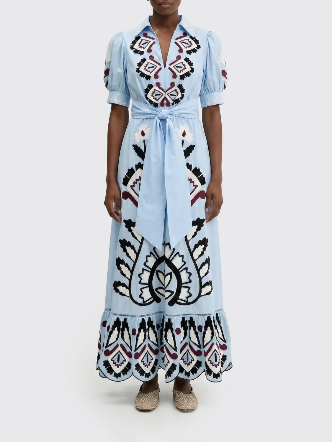 Blue Artisanal Embroidered Lace Front Bow Maxi Dress
