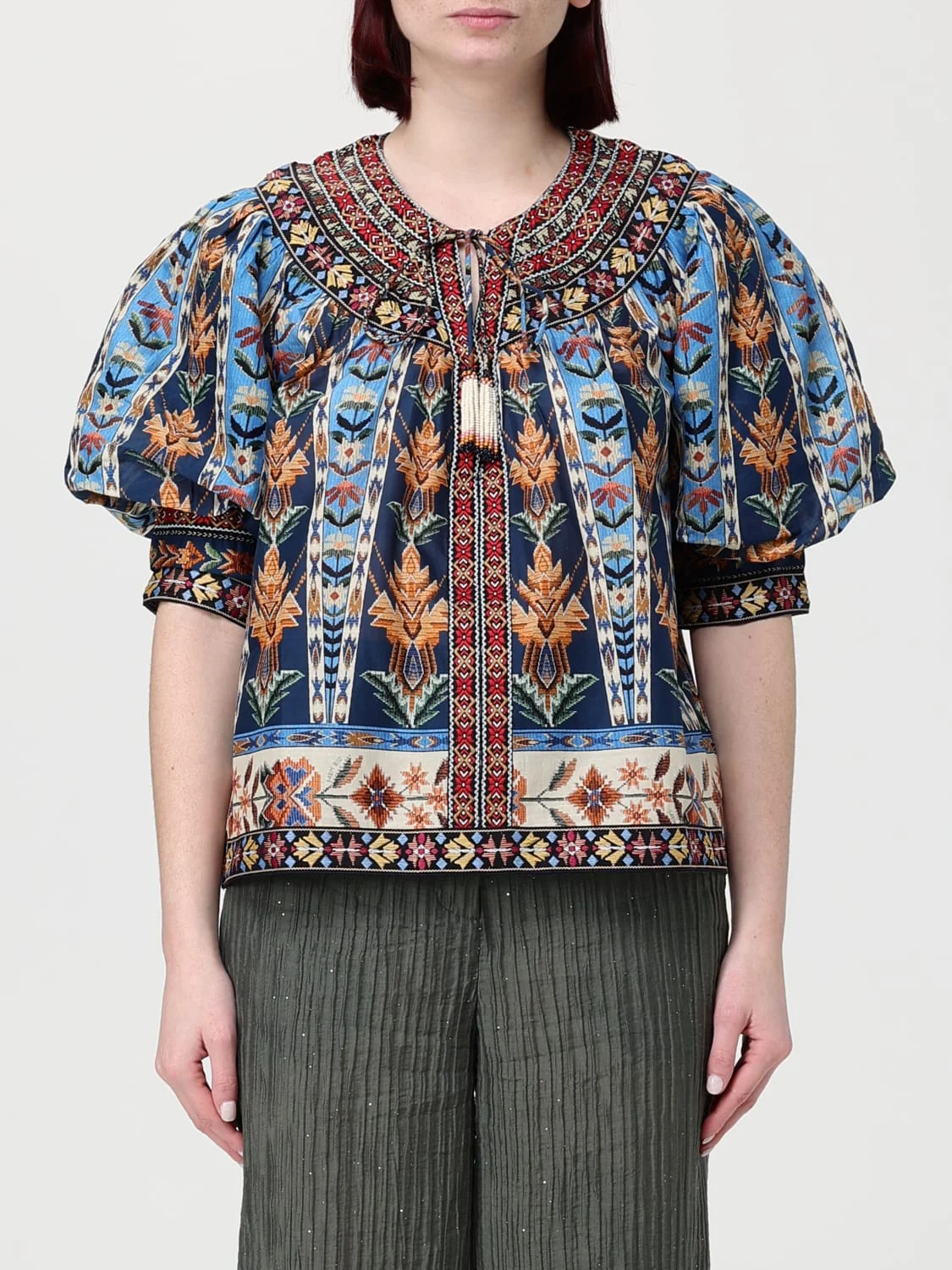 Blue Embroidered Tapestry Tassels Puff Sleeve Blouse