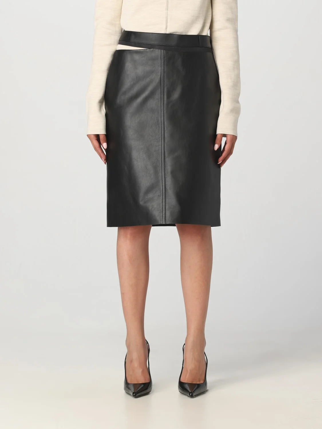 DESCRIPTION - Style: Classic - Model: Cut-out, Sheath - Waist: High - Bottom: With straight hemline - Length: Midi skirts - Materials: Smooth calfskin - Pattern: Plain-colored DETAILS AND CARE Composition 100%VIT SIZE AND FIT Sizes not available Size and fit Regular fit Designer code: FPD774AQ31 F0GME Giglio Code: 392133 Designer: Fendi Collection: Fendi Woman Category: Clothing Fendi