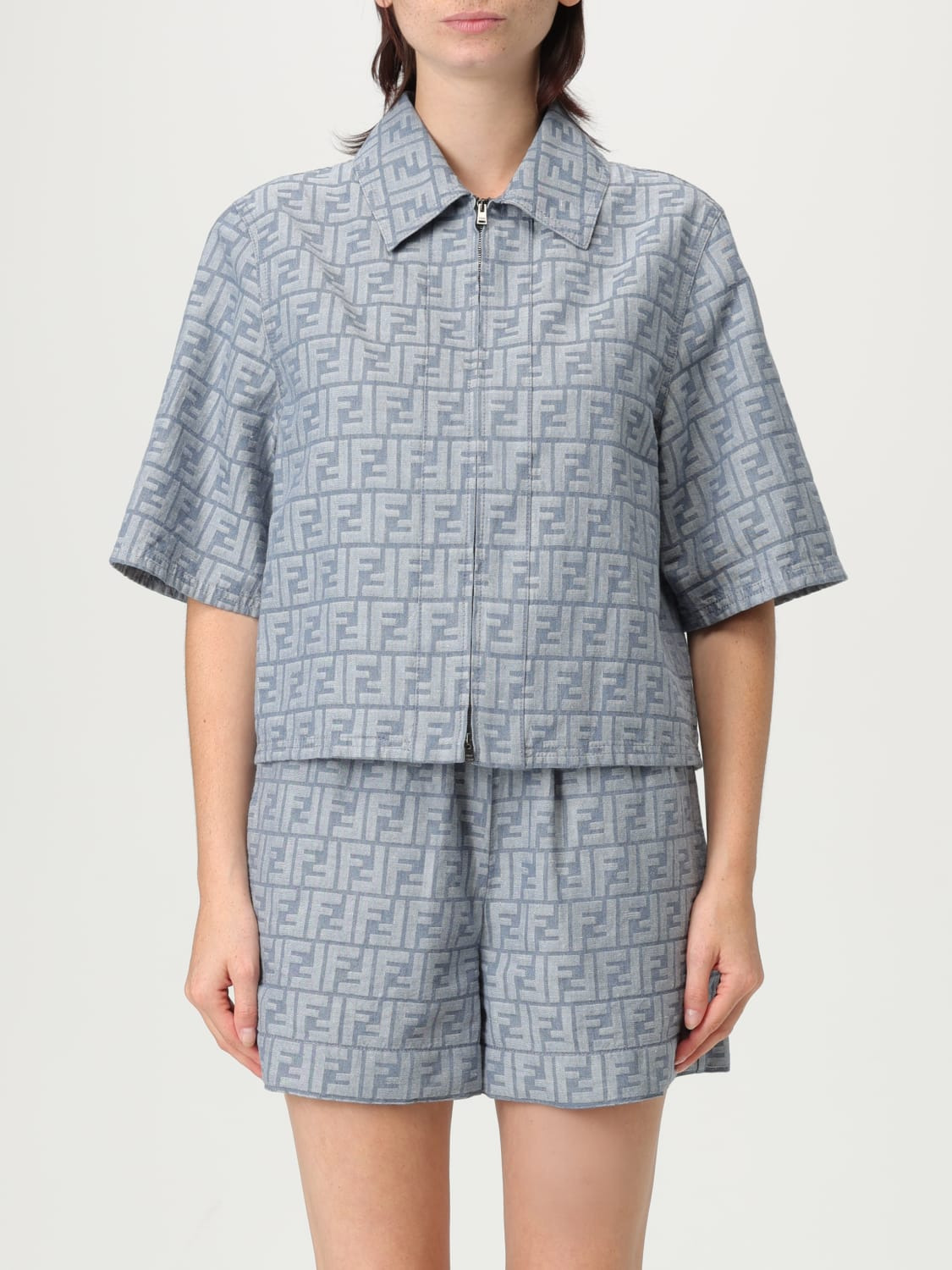 DESCRIPTION - Style: Casual - Logo: FF monogram - Model: Shirt - Neck: Classic - Shoulders: Relaxed - Sleeves: Short - Closure: With zip and double slider - Bottom: With straight hemline - Length: Short jackets - Materials: Cotton denim - Pattern: Monogram DETAILS AND CARE Composition not available SIZE AND FIT Sizes not available Size and fit Relaxed fit Designer code: FLF790ASMF F1SAT Giglio Code: H18194 Designer: Fendi Collection: Fendi Woman Category: Clothing Fendi