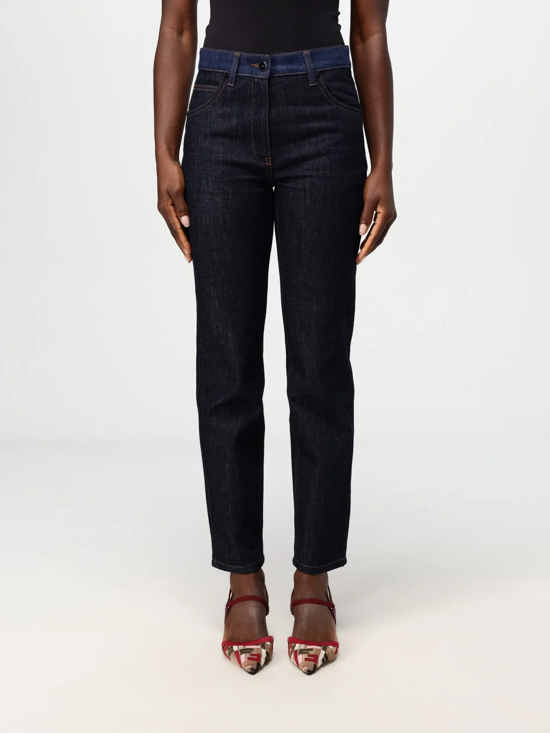 DESCRIPTION - Details: With contrasting seams - Pockets: 5-pocket - Waist: With loops - Bottom: With straight hemline - Logo: With logo - Closure: With button and zip - Materials: Cotton denim - Pattern: Plain-colored DETAILS AND CARE Composition 100%CO SIZE AND FIT Sizes not available Size and fit Slim fit Designer code: FLP851AT1A F1PNC Giglio Code: F98040 Designer: Fendi Collection: Fendi Woman Category: Clothing Fendi