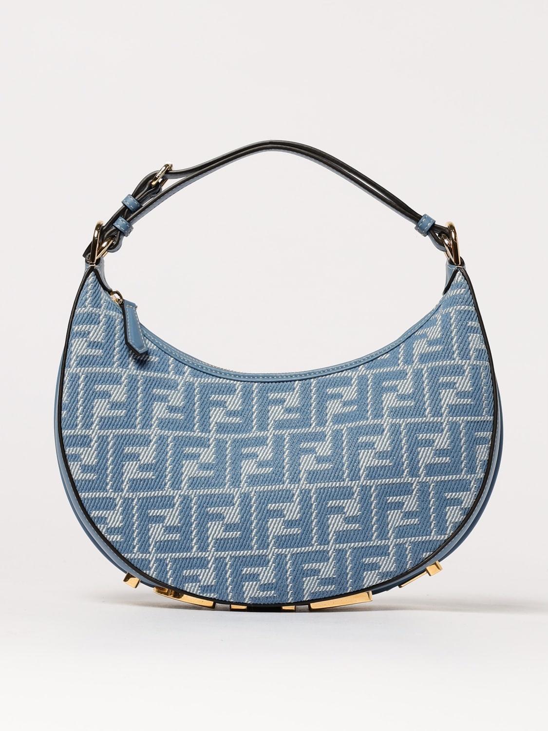 DESCRIPTION - Style: Contemporary - Logo: Metallic, Jacquard, FF monogram - Model: Hand, Shoulder , Hobo - Closure: With snap-hook , With zip - Shape: Half-crescent - Shoulder strap: Adjustable and removable - Materials: Denim, Calfskin - Pattern: All-over logo DETAILS AND CARE Composition 100 AF SIZE AND FIT Sizes Width : 29 cm Height: 24 cm Depth: 10 cm Handle height: 18 cm Designer code: 8BR798 AUPX F1SNB Giglio Code: 429702 Designer: Fendi Collection: Fendi Woman Category: Bags Fendi