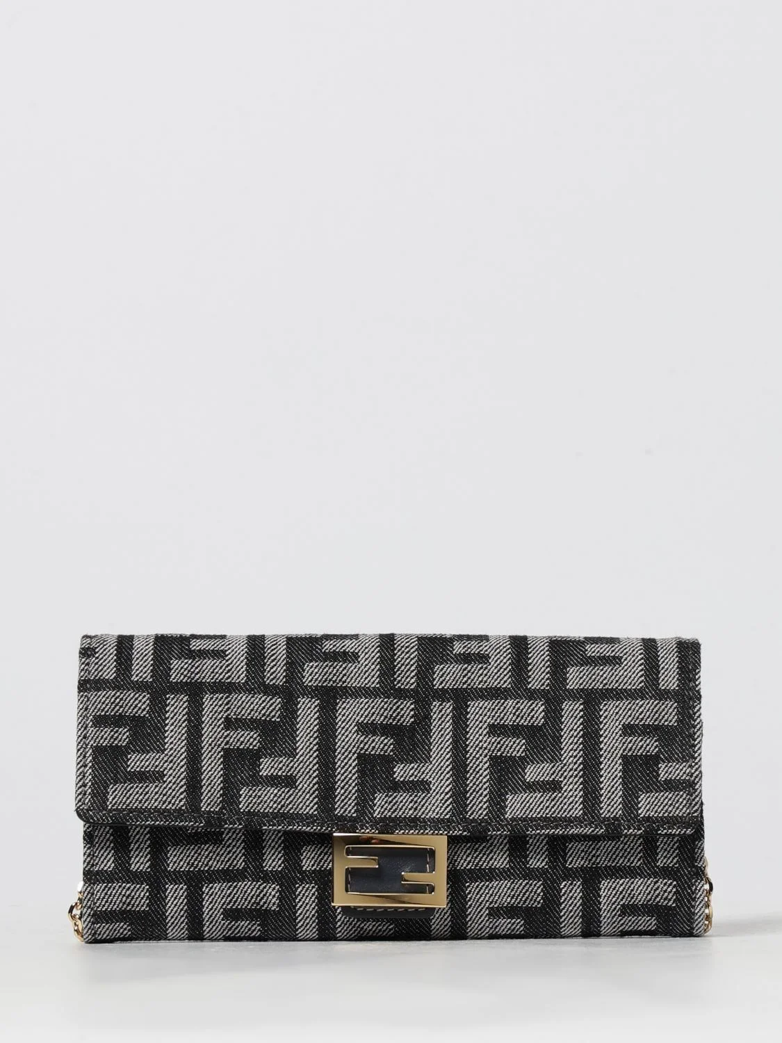 DESCRIPTION - Logo: FF monogram, Jacquard - Lining: 10 slit pockets, 4 slit pockets, Con 2 scomparti, With zipped partition - Model: Continental - Shape: Rectangular - Shoulder strap: Metal mesh, Removable - Closure: With flap and press stud - Measurements: Shoulder strap length from shoulder: 55 cm - Materials: Smooth calfskin - Pattern: Monogram DETAILS AND CARE Composition 66%CO,34%PL SIZE AND FIT Sizes Designer code: 8M0365AUT4 F1UJ5 Giglio Code: 432308 Designer: Fendi Collection: Fendi Woman Category: Accessories Fendi