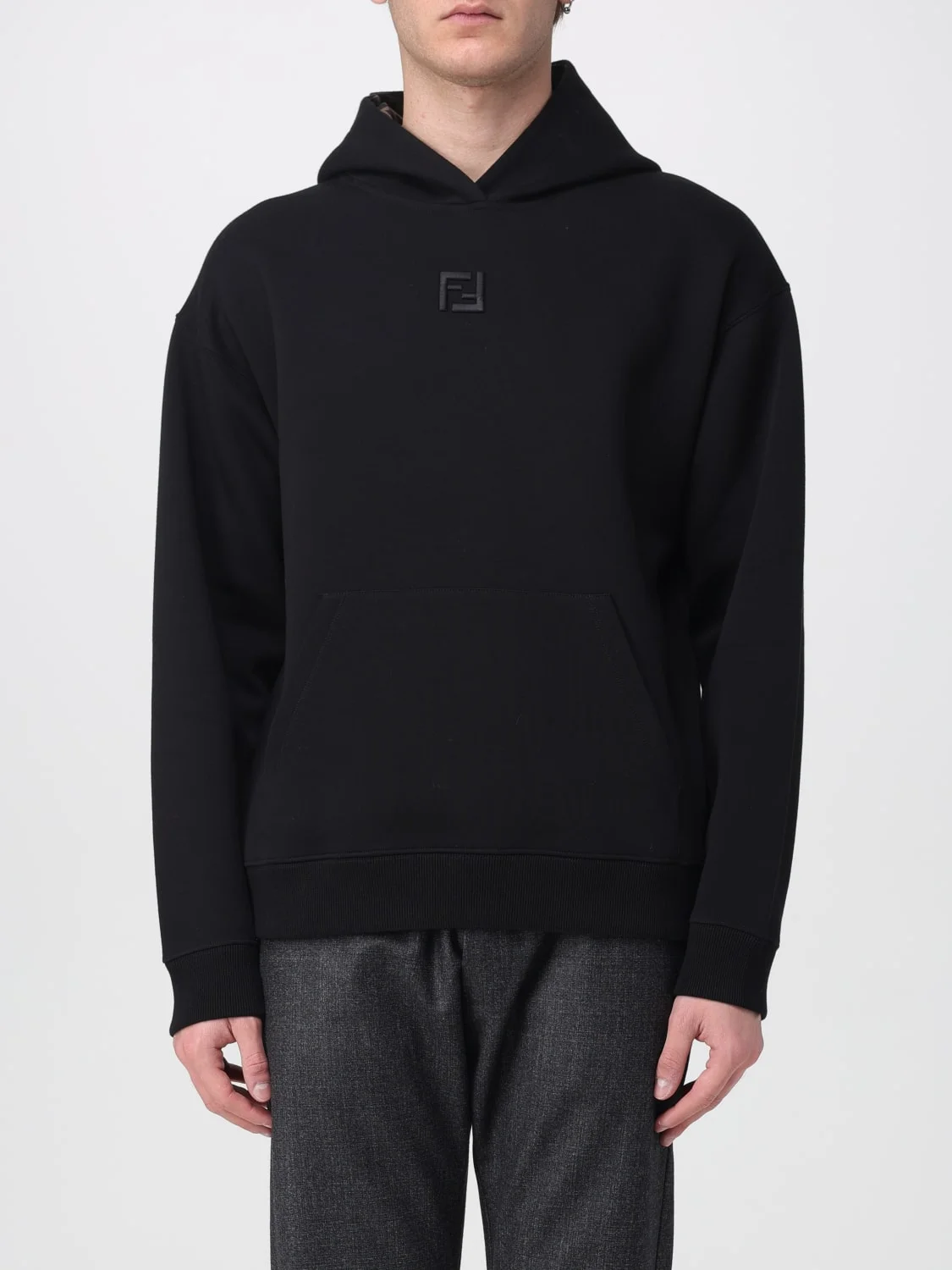 DESCRIPTION - Style: Sporty - Logo: FF monogram - Shoulders: Relaxed - Sleeves: Long - Cuffs: Stretch - Pockets: Kangaroo pocket - Bottom: Stretch - Model: With hood - Materials: Cotton - Pattern: Logo, Plain-colored DETAILS AND CARE Composition GENERAL COTTON 96 - GENERAL POLYAMIDE 4 - SIZE AND FIT Sizes not available Size and fit Slim fit Designer code: FY1143ATL9 F0QA1 Giglio Code: H46628 Designer: Fendi Collection: Fendi Men Category: Clothing Fendi