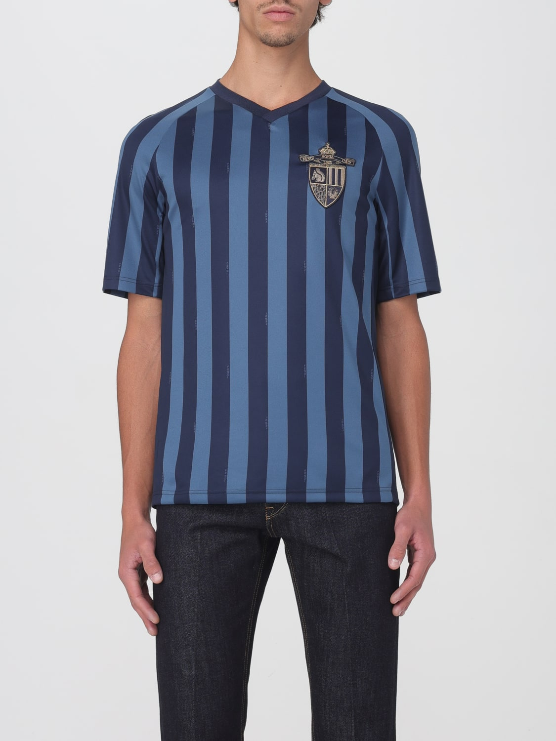DESCRIPTION - Style: Sporty - Logo: Emblem - Neckline: V neckline - Shoulders: Regular - Sleeves: Short - Bottom: With straight hemline - Materials: Polyester - Pattern: Two-tone stripes DETAILS AND CARE Composition not available SIZE AND FIT Sizes not available Size and fit Slim fit Designer code: FAF747AU8T F1PMG Giglio Code: G66645 Designer: Fendi Collection: Fendi Men Category: Clothing Fendi
