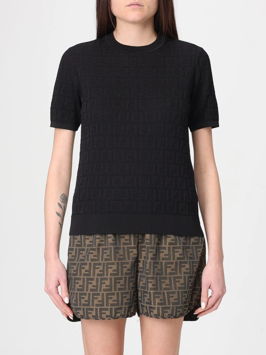 DESCRIPTION - Style: Classic - Model: Crewneck - Logo: FF monogram - Neckline: Crewneck - Shoulders: Regular - Sleeves: Short - Cuffs: Ribbed - Bottom: With ribbed edges - Materials: Viscose - Pattern: Monogram DETAILS AND CARE Composition 54%CO,46%VI SIZE AND FIT Sizes not available Size and fit Regular fit Designer code: FZXD57AUZR F0GME Giglio Code: 440211 Designer: Fendi Collection: Fendi Woman Category: Clothing Fendi