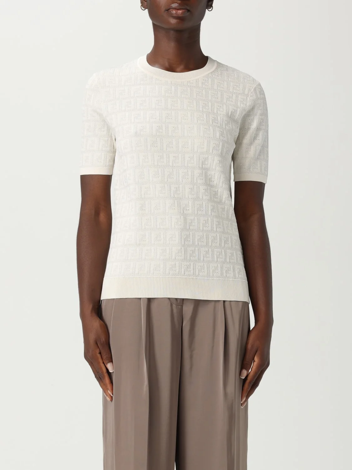DESCRIPTION - Style: Casual - Logo: FF monogram - Model: Crewneck - Neckline: Crewneck - Shoulders: Regular - Sleeves: Short - Bottom: With straight hemline - Materials: Cotton blend - Pattern: All-over monogram DETAILS AND CARE Composition not available SIZE AND FIT Sizes not available Size and fit Regular fit Designer code: FZXD57AUZR F0ZNM Giglio Code: H10959 Designer: Fendi Collection: Fendi Woman Category: Clothing Fendi