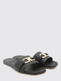 DESCRIPTION - Logo: Metallic, Gancini - Lining: Leather, With imprinted logo - Model: Slip on - Toe: Open, Squared - Sole: Leather - Heel: Low heel - Materials: Nappa leather - Pattern: Monogram DETAILS AND CARE Composition _100% LE SIZE AND FIT Sizes not available Designer code: 01G997 769636 001 Giglio Code: F14173 Designer: Ferragamo Collection: Ferragamo Woman Category: Shoes Ferragamo