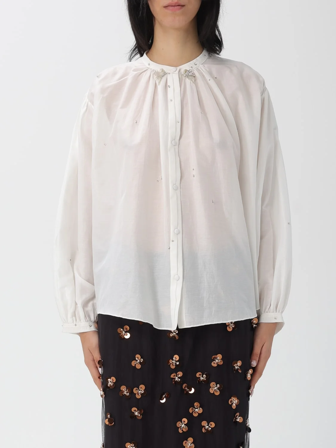 DESCRIPTION - Style: Glamour - Details: With rhinestones - Neck: Mandarin collar - Shoulders: Relaxed - Closure: With buttons - Bottom: With curved hemline - Sleeves: Long sleeve shirts - Materials: Cotton, Silk - Pattern: Embroidery, Plain-colored DETAILS AND CARE Composition GENERAL COTTON 70 - GENERAL SILK 30 - SIZE AND FIT Sizes not available Size and fit Regular fit Designer code: 14093MYSHIRT 0003 Giglio Code: H40751 Designer: Forte Forte Collection: Forte Forte Woman Category: Clothing Forte Forte