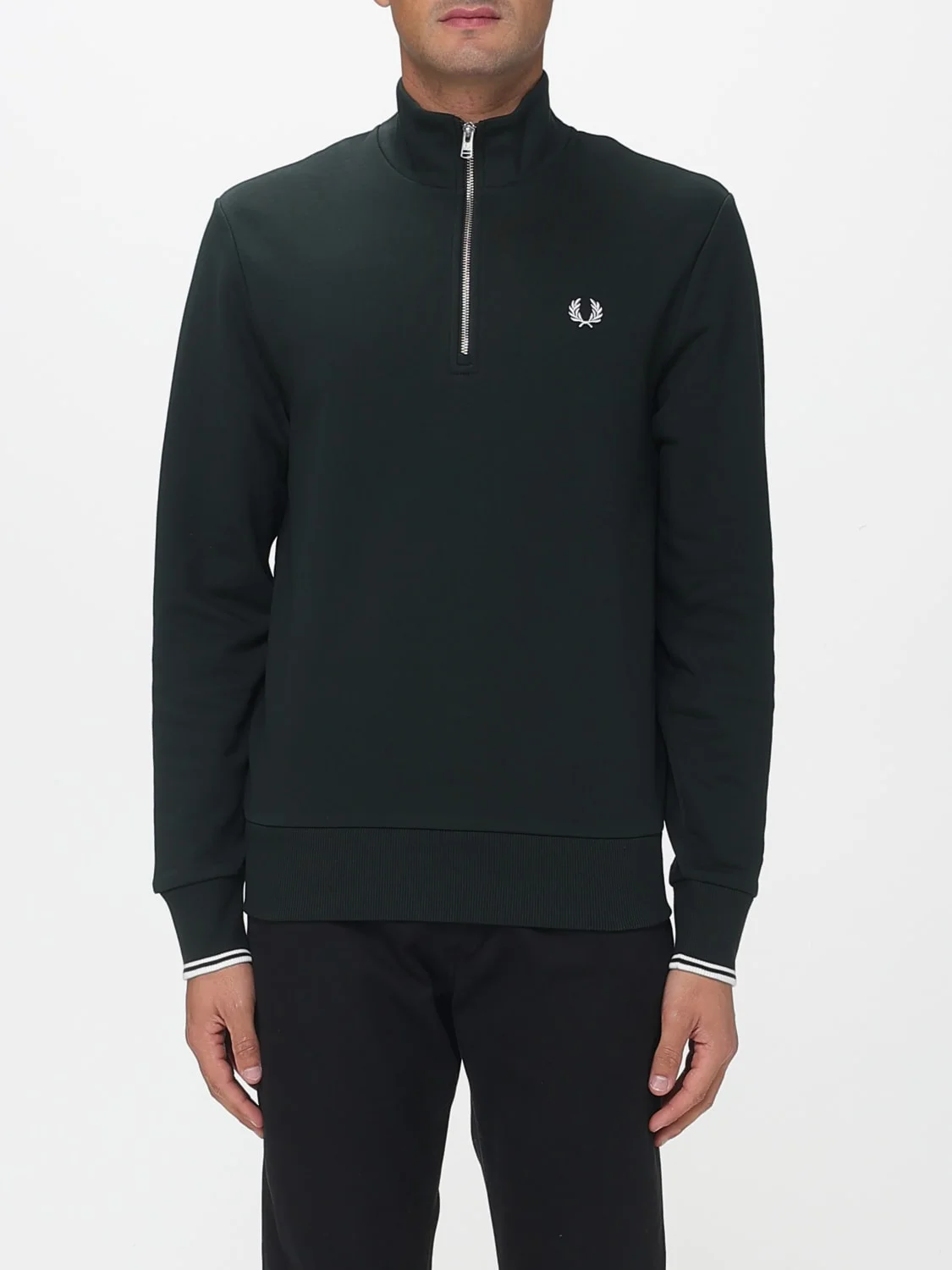 DESCRIPTION - Style: Sporty - Logo: Contrasting, Embroidered - Neck: High - Shoulders: Regular - Sleeves: Long - Closure: With interrupted zip - Bottom: With straight hemline - Materials: Cotton - Pattern: Logo, Plain-colored DETAILS AND CARE Composition 100% COTTON SIZE AND FIT Sizes not available Size and fit Regular fit Designer code: M3574 T50 Giglio Code: E85169 Designer: Fred Perry Collection: Fred Perry Men Category: Clothing Fred Perry