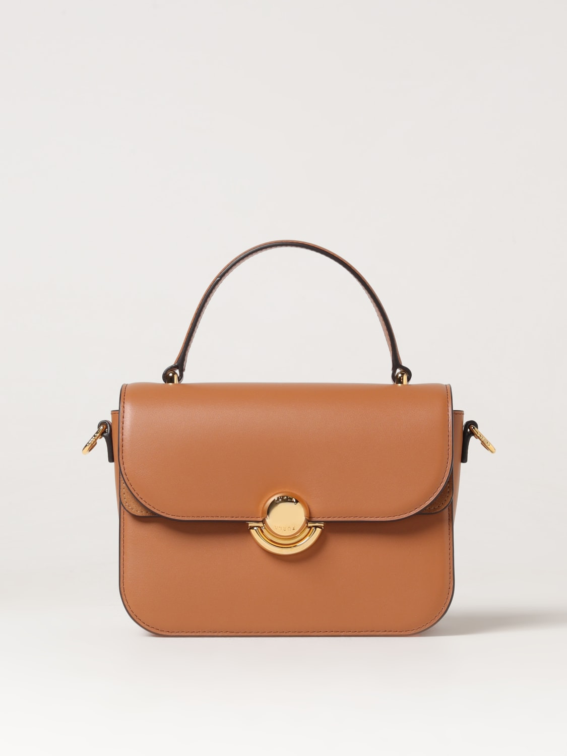 DESCRIPTION - Logo: Engraved - Model: Hand - Closure: With button flap - Shape: Rectangular - Handle: Flat - Shoulder strap: Adjustable and removable - Materials: Smooth calfskin - Pattern: Plain-colored DETAILS AND CARE Composition 0576E100%LEATHER I40%PA+40%PU+20%PL SIZE AND FIT Sizes Width : 20 cm Height: 15 cm Depth: 10 cm Handle height: 10 cm Designer code: WB01475BX0428 RY000 Giglio Code: 418893 Designer: Furla Collection: Furla Woman Category: Bags Furla