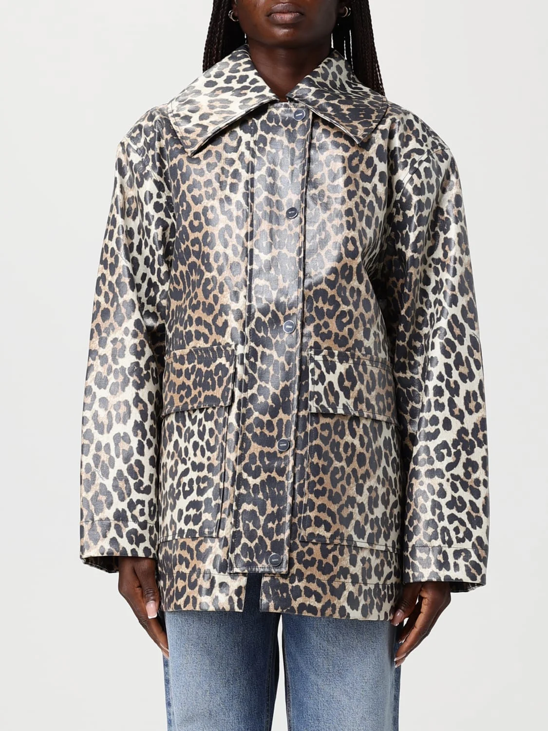 DESCRIPTION - Style: Safari - Model: Shirt - Neck: Sailor dress - Shoulders: Relaxed - Sleeves: Long - Closure: Concealed, With buttons - Bottom: With straight hemline - Pockets: Patch with flap - Occasion: Morning - Length: Short jackets - Materials: Cotton canvas, Waxed cotton - Pattern: Animal print DETAILS AND CARE Composition not available SIZE AND FIT Sizes not available Size and fit Relaxed fit Designer code: A1010083 859 Giglio Code: I00283 Designer: Ganni Collection: Clothing Ganni Category: Clothing > Jacket