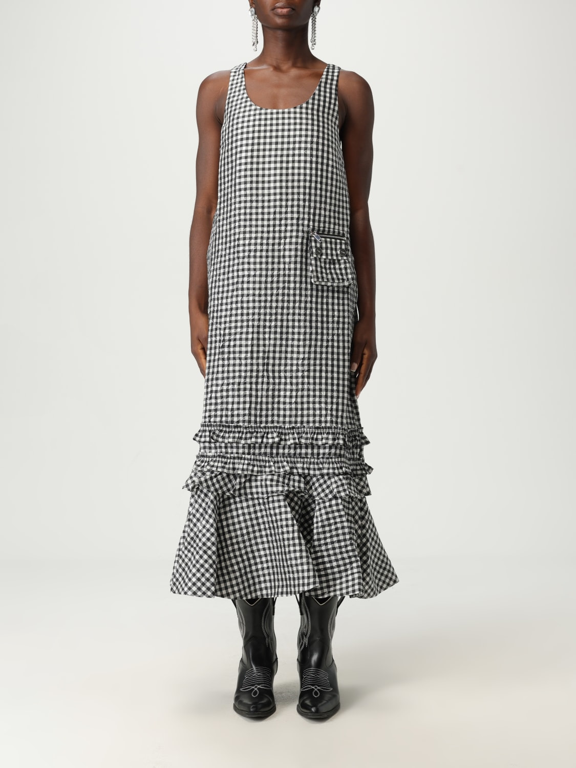 DESCRIPTION - Style: Urban-street - Details: With ruffles - Neckline: U neckline - Shoulders: Regular - Closure: Back closure with zip - Pockets: Patch pocket with flap and button - Bottom: With straight hemline - Length: Long dresses - Occasion: Morning dresses - Sleeves: Off-the-shoulder dresses - Materials: Crepe - Pattern: Vichy DETAILS AND CARE Composition 100% polyester SIZE AND FIT Sizes not available Size and fit Regular fit Designer code: W0463 099 Giglio Code: H13842 Designer: Ganni Collection: Ganni Woman Category: Clothing Ganni