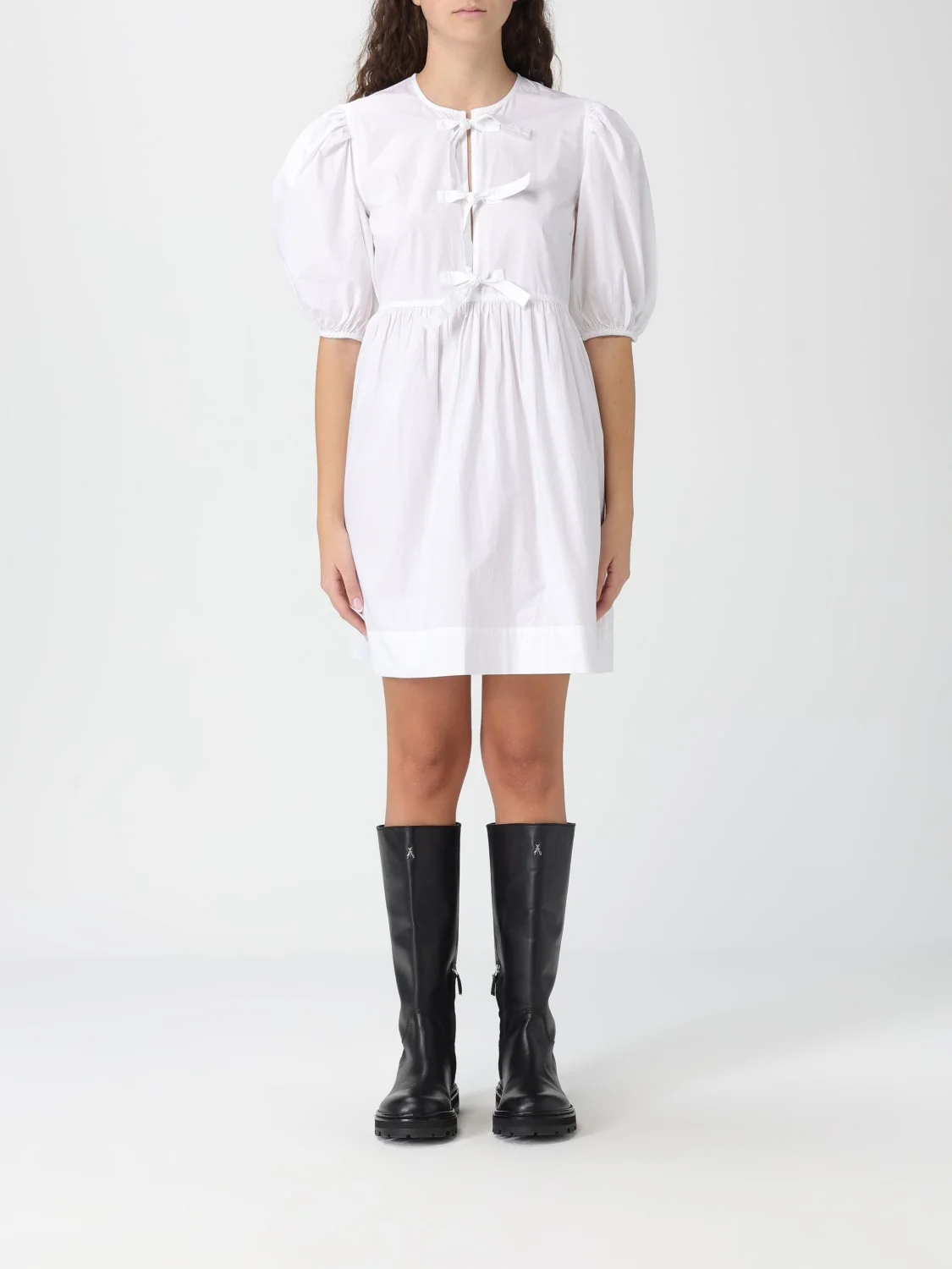 DESCRIPTION - Style: Romantic - Details: With bow - Model: Chemisier - Neckline: V neckline - Shoulders: Regular - Sleeves: Balloon - Bottom: With straight hemline - Materials: Cotton poplin - Pattern: Plain-colored DETAILS AND CARE Composition 100% organic cotton SIZE AND FIT Sizes not available Size and fit Regular fit Designer code: F9170 151 Giglio Code: G45552 Designer: Ganni Collection: Ganni Woman Category: Clothing Ganni