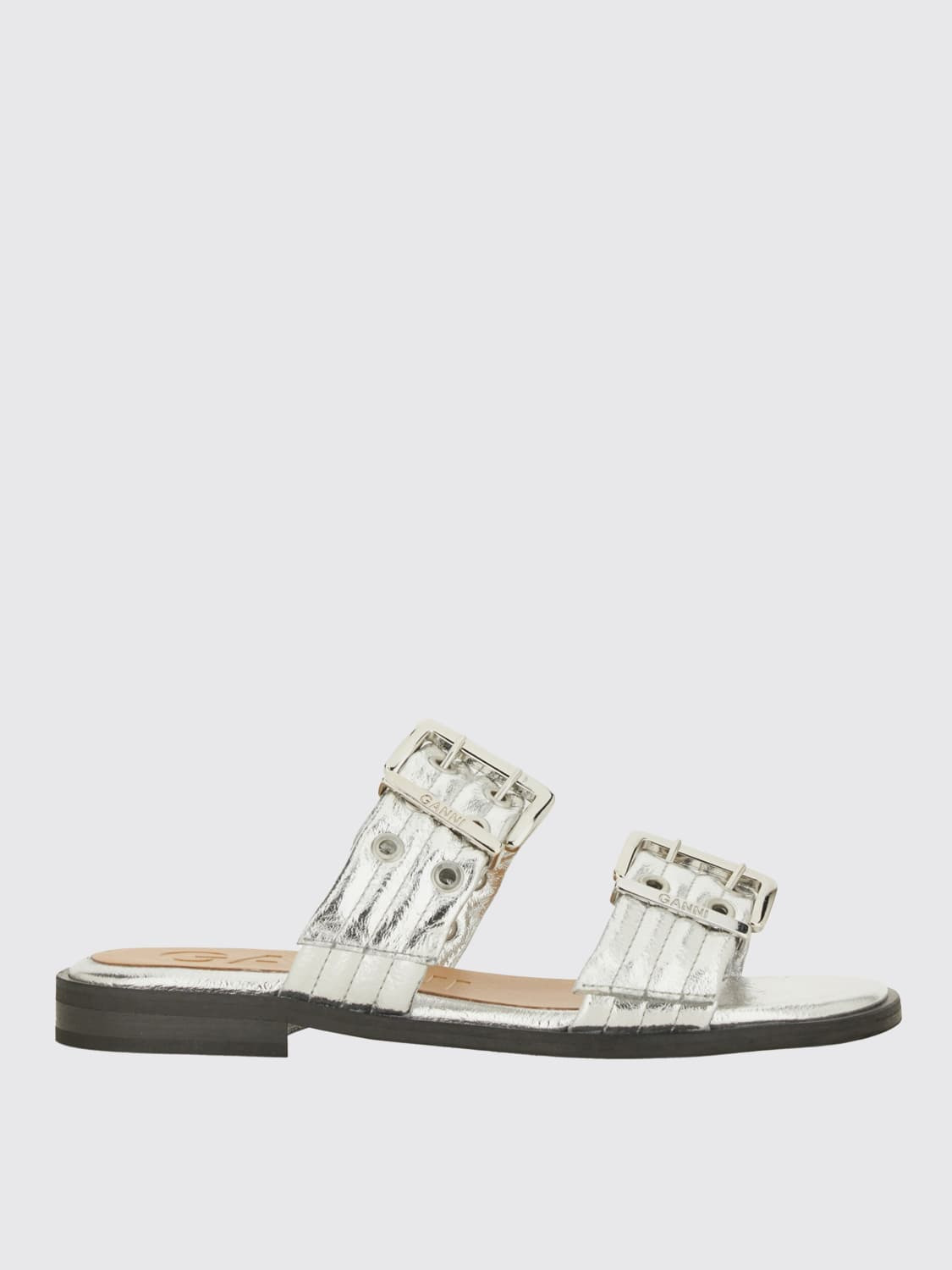 DESCRIPTION - Logo: Engraved - Model: Slip on - Closure: With double belt with buckles - Toe: Open - Sole: Rubber - Heel: Low heel - Lining: With logo - Sustainable: Made with recycled materials - Materials: Syntethic laminated leather - Pattern: Plain-colored DETAILS AND CARE Composition POLYESTER SIZE AND FIT Sizes not available Designer code: S2666 018 Giglio Code: H15650 Designer: Ganni Collection: Ganni Woman Category: Shoes Ganni
