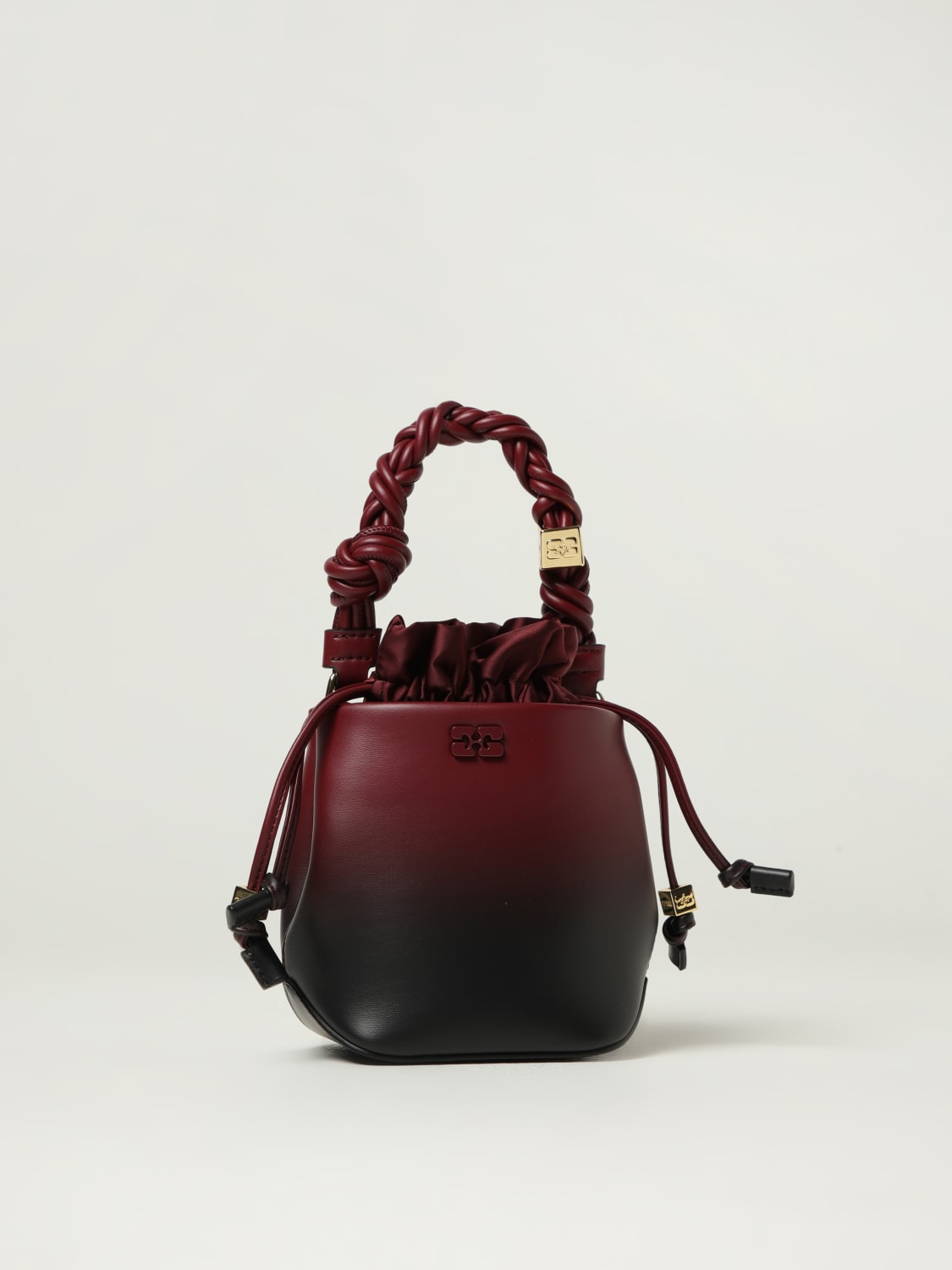DESCRIPTION - Style: Classic - Logo: Ganni Butterfly - Model: Bucket - Closure: With drawstrings - Shape: Cylindrical - Shoulder strap: Adjustable and removable - Handle: With knot - Sustainable: Made with recycled materials - Materials: Recycled leather - Pattern: Plain-colored DETAILS AND CARE Composition 65% calf leather 19% polyurethane 16% polyest SIZE AND FIT Sizes Width : 10 cm Height: 15 cm Depth: 9 cm Designer code: A6703 730 Giglio Code: H18169 Designer: Ganni Collection: Ganni Woman Category: Bags Ganni