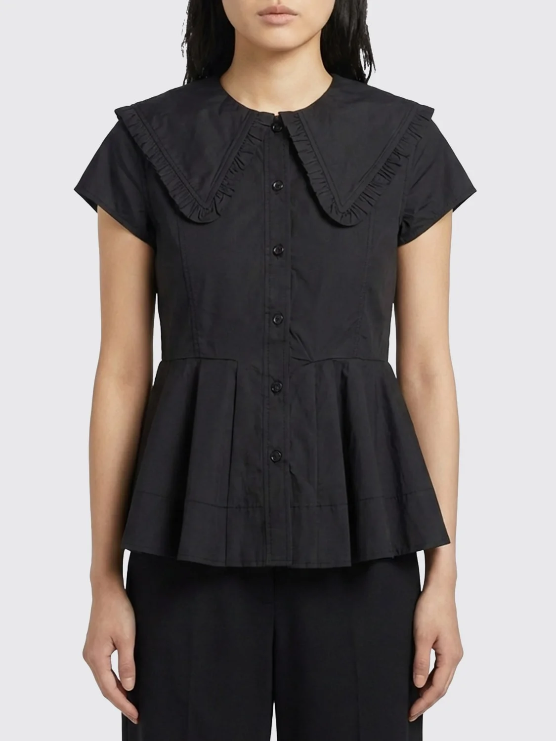 DESCRIPTION - Style: Romantic, Vintage - Neck: Sailor dress - Shoulders: Regular - Closure: With buttons - Bottom: With straight hemline - Sleeves: Short sleeve shirts - Materials: Organic cotton - Pattern: Plain-colored DETAILS AND CARE Composition 97%organic cotton, 3%elastane SIZE AND FIT Sizes not available Size and fit Regular fit Designer code: A1040093 099 Giglio Code: H81679 Designer: Ganni Collection: Ganni Woman Category: Clothing Ganni