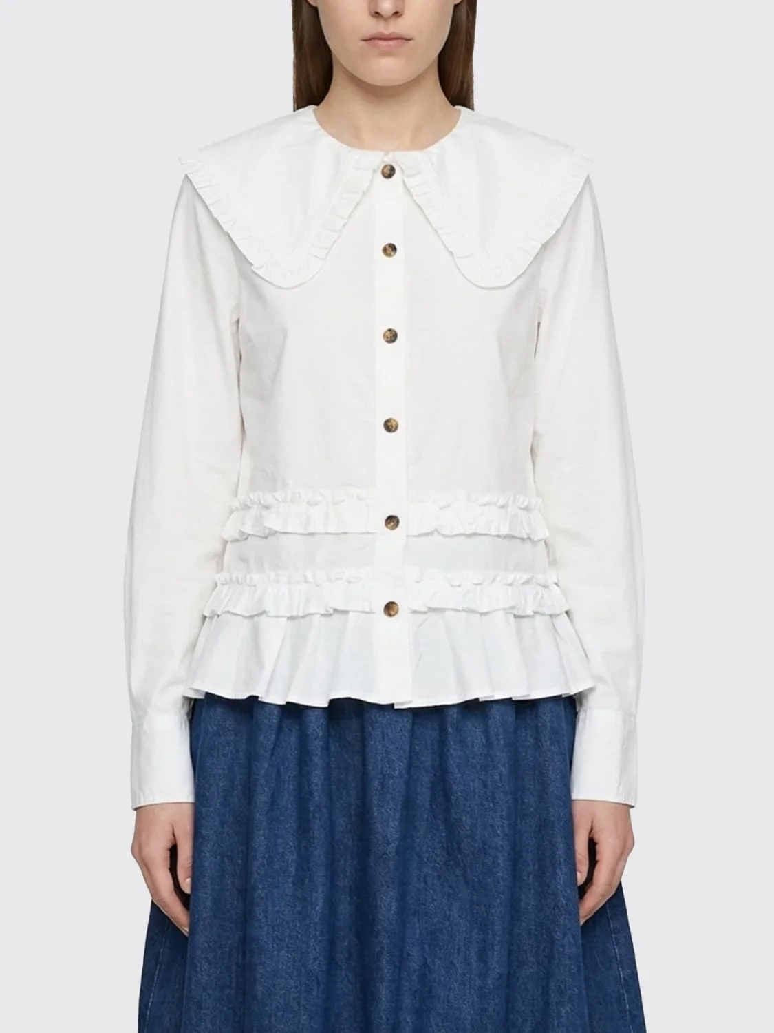 DESCRIPTION - Style: Contemporary, Romantic - Neck: Sailor dress - Neckline: Crewneck - Shoulders: Regular - Cuffs: 3-button - Closure: With buttons - Bottom: With flounce - Sleeves: Long sleeve shirts - Materials: Cotton - Pattern: Plain-colored DETAILS AND CARE Composition COTTON SIZE AND FIT Sizes not available Size and fit Regular fit Designer code: A1040096 ZZ8 Giglio Code: H93960 Designer: Ganni Collection: Ganni Woman Category: Clothing Ganni