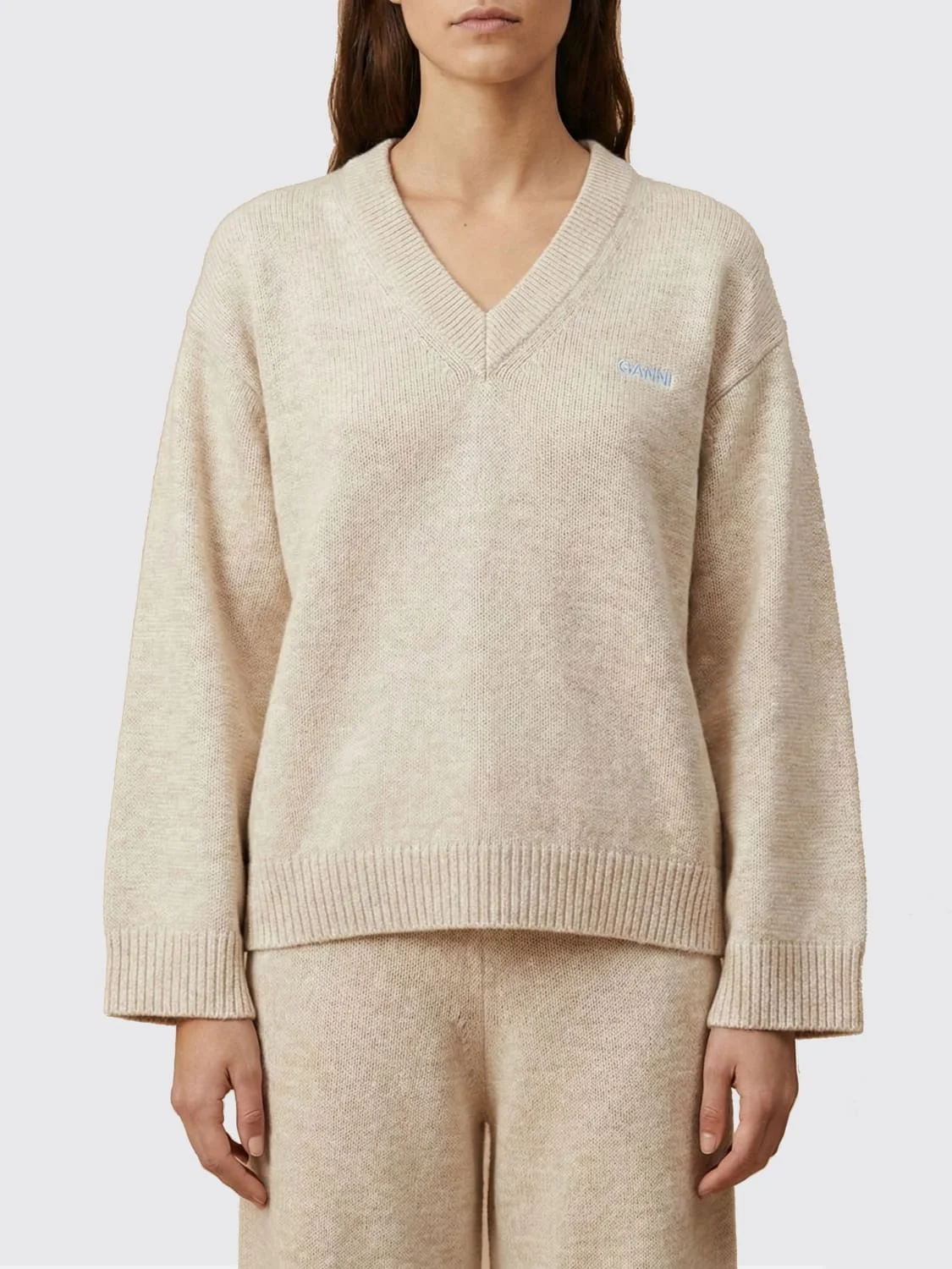 DESCRIPTION - Style: Casual - Logo: Contrasting - Neckline: V neckline - Shoulders: Relaxed - Sleeves: Long - Cuffs: Ribbed - Bottom: With ribbed edges, With straight hemline - Materials: Wool - Pattern: Plain-colored DETAILS AND CARE Composition WOOL SIZE AND FIT Sizes not available Size and fit Regular fit Designer code: K2591 934 Giglio Code: H86246 Designer: Ganni Collection: Ganni Woman Category: Clothing Ganni
