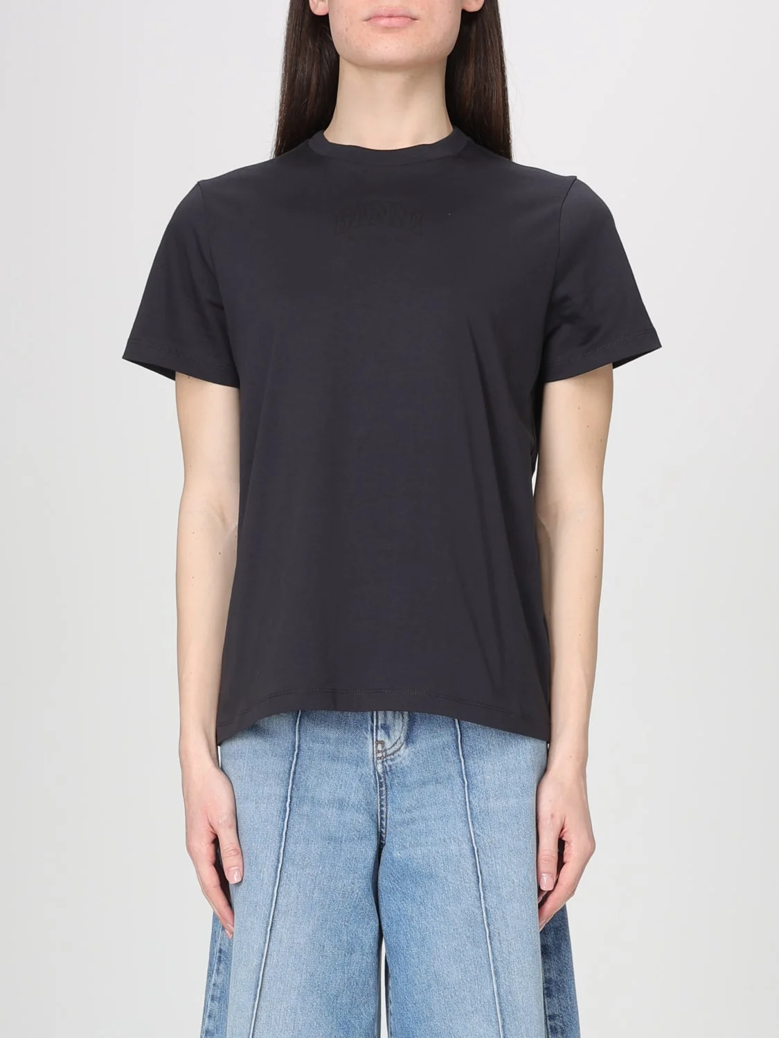DESCRIPTION - Style: Contemporary - Logo: Contrasting, Embroidered - Model: Crewneck - Neckline: Crewneck - Shoulders: Relaxed - Sleeves: Short - Bottom: With straight hemline - Materials: Organic cotton - Pattern: Logo DETAILS AND CARE Composition Organic Cotton | 100% Organic Cotton SIZE AND FIT Sizes not available Size and fit Relaxed fit Designer code: A1050057 252 Giglio Code: H83823 Designer: Ganni Collection: Ganni Woman Category: Clothing Ganni