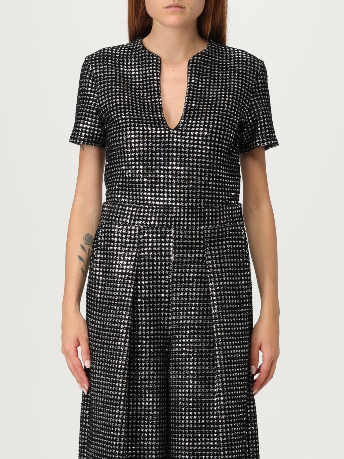 DESCRIPTION - Style: Classic - Neckline: V neckline - Shoulders: Regular - Closure: With snap buttons on the bottom - Bottom: With straight hemline - Sleeves: Short sleeve tops - Materials: Boucle - Pattern: undefined DETAILS AND CARE Composition 12% ELASTANE, 88% POLYESTER SIZE AND FIT Sizes not available Size and fit Regular fit Designer code: GW002172AF19855 FC056 Giglio Code: 430560 Designer: Giorgio Armani Collection: Giorgio Armani Woman Category: Clothing Giorgio Armani