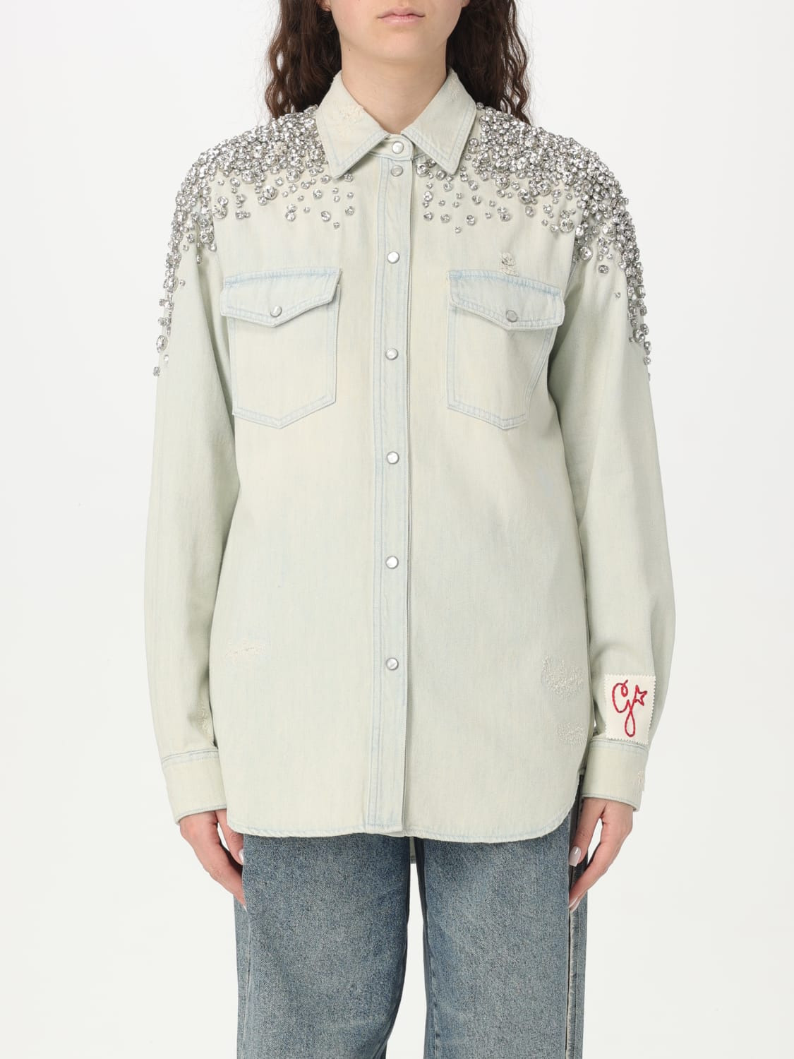 Women's bleached boyfriend shirt with cabochon crystals