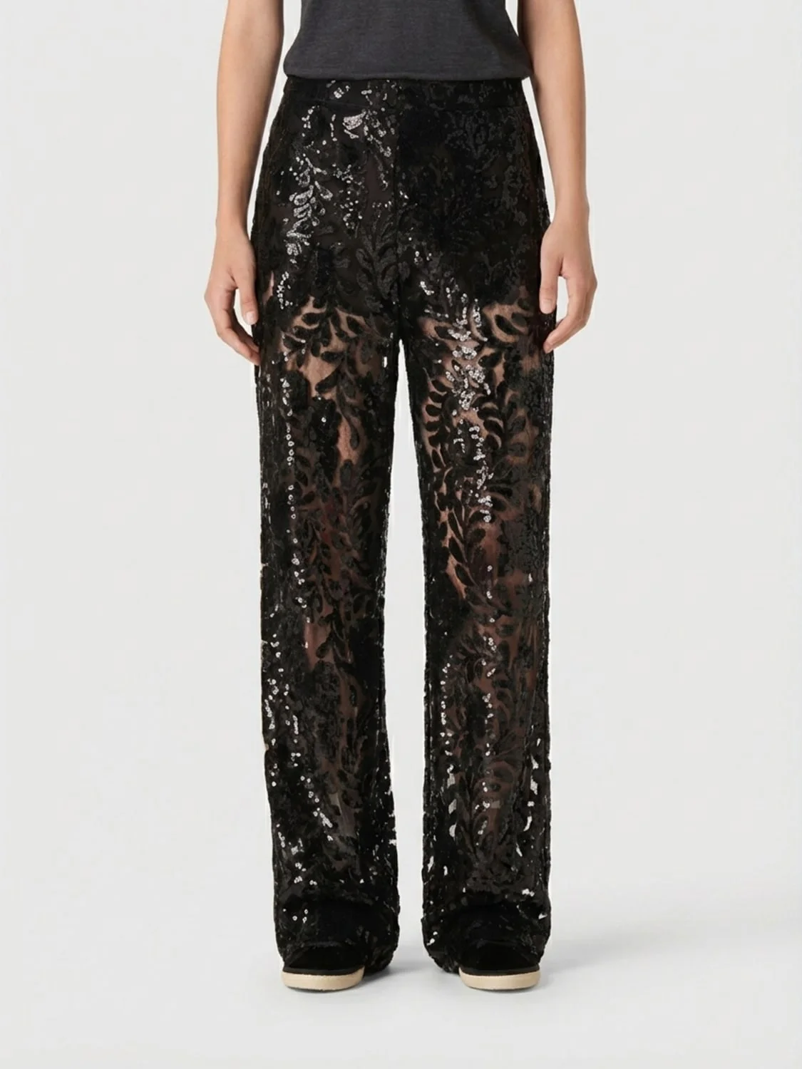 Women's tulle pants with floral embroidery in black sequins