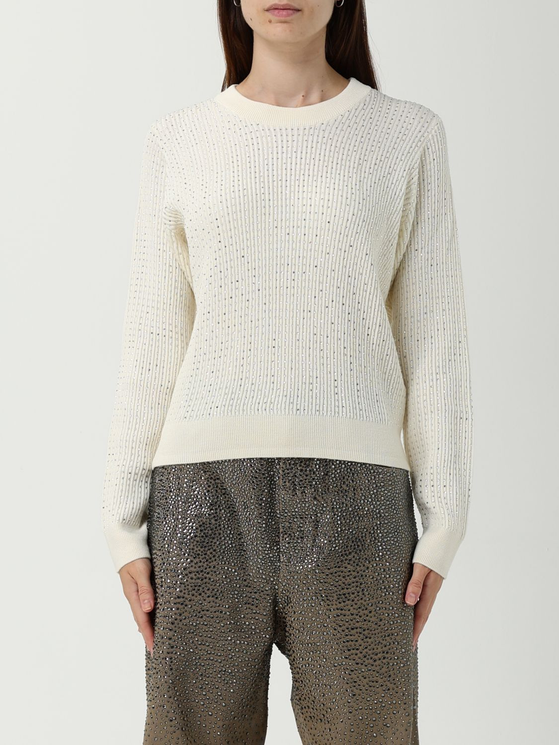 Women's crew-neck sweater in white merino wool with all-over crystals