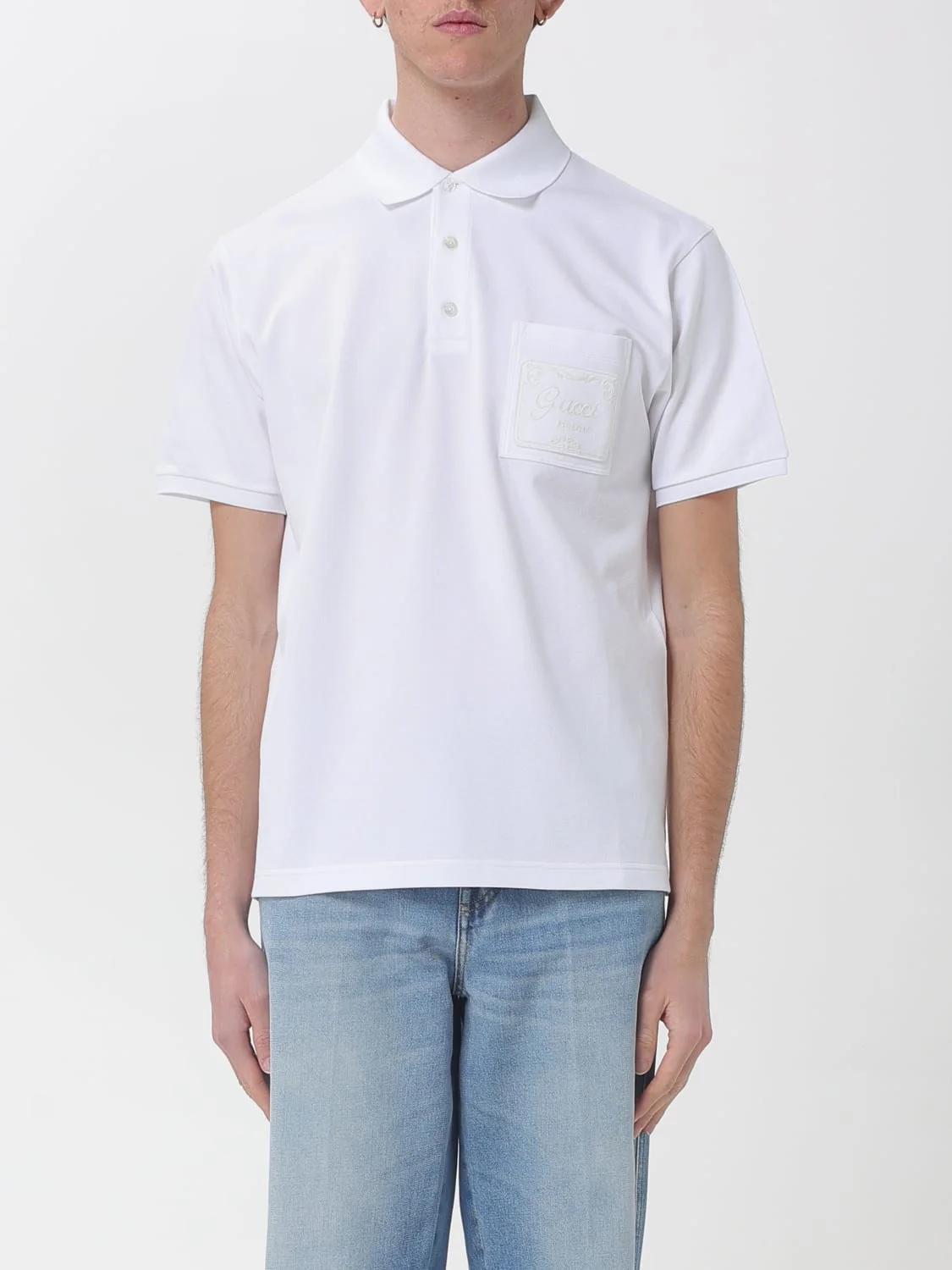 DESCRIPTION - Style: Sporty - Logo: Embroidered, Tone-on-tone - Neck: Classic - Shoulders: Regular - Sleeves: Short - Closure: With 3-button placket - Pockets: Patch pocket - Bottom: With straight hemline - Occasion: Morning - Materials: Cotton - Pattern: Plain-colored DETAILS AND CARE Composition 100% Cotton Mix SIZE AND FIT Sizes not available Size and fit Regular fit Designer code: 854633XJHOH 9051 Giglio Code: H97404 Designer: Gucci Collection: Gucci Men Category: Clothing Gucci
