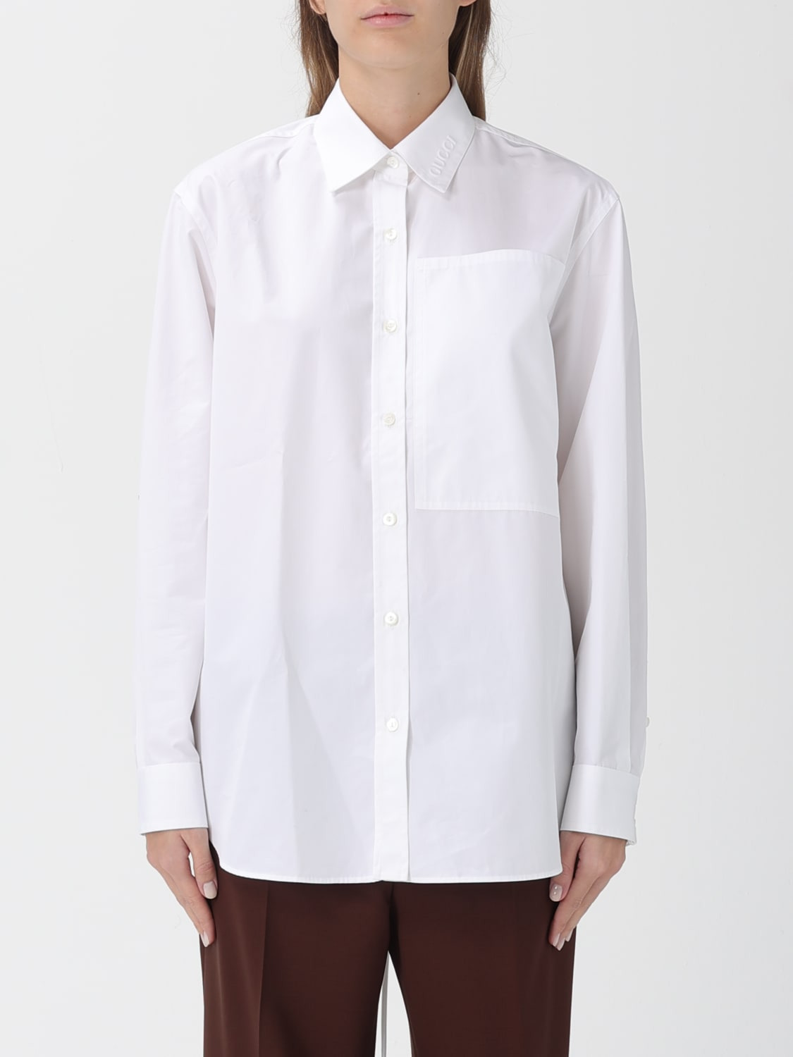 DESCRIPTION - Style: Classic, Elegant - Neck: French - Shoulders: Regular - Closure: With buttons - Pockets: Patch pocket - Bottom: With curved hemline - Sleeves: Long sleeve shirts - Materials: Cotton poplin - Pattern: Plain-colored DETAILS AND CARE Composition T 100% COTTON SIZE AND FIT Sizes not available Size and fit Regular fit Designer code: 816008Z7ADR 9000 Giglio Code: 426302 Designer: Gucci Collection: Gucci Woman Category: Clothing Gucci