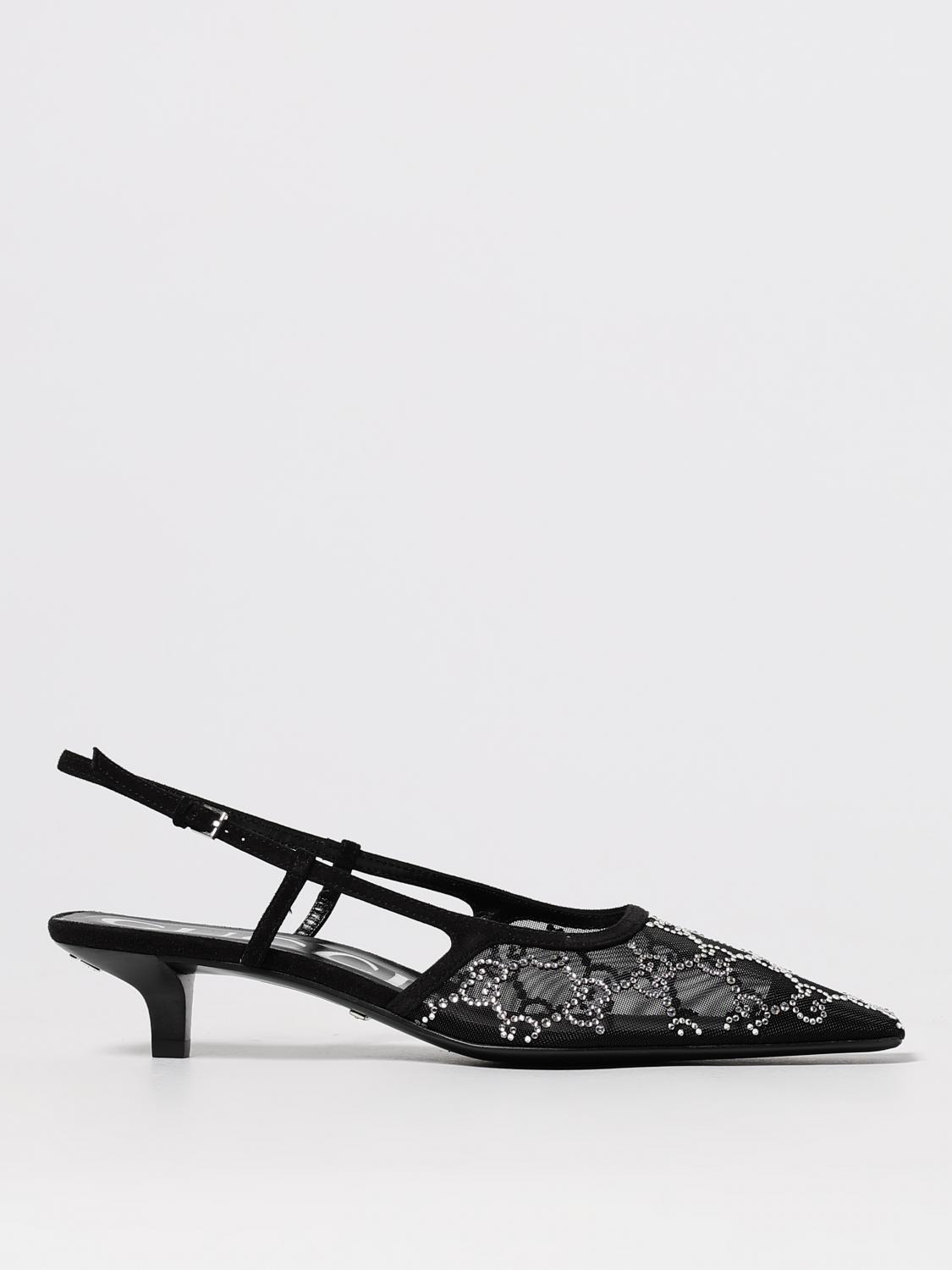 DESCRIPTION - Logo: Gucci GG monogram, Rhinestone - Lining: Leather, Nylon, With logo - Model: Slingback - Toe: Tapered - Sole: Leather - Heel: With adjustable strap, Tacco basso a stiletto - Materials: Fishnet nylon, Suede calfskin - Pattern: Monogram DETAILS AND CARE Composition Other->Fabric100.0 % Furs & Skins->Suede100.0 SIZE AND FIT Sizes Heel: 4 cm Designer code: 675829F13A0 1000 Giglio Code: H21199 Designer: Gucci Collection: Gucci Woman Category: Shoes Gucci