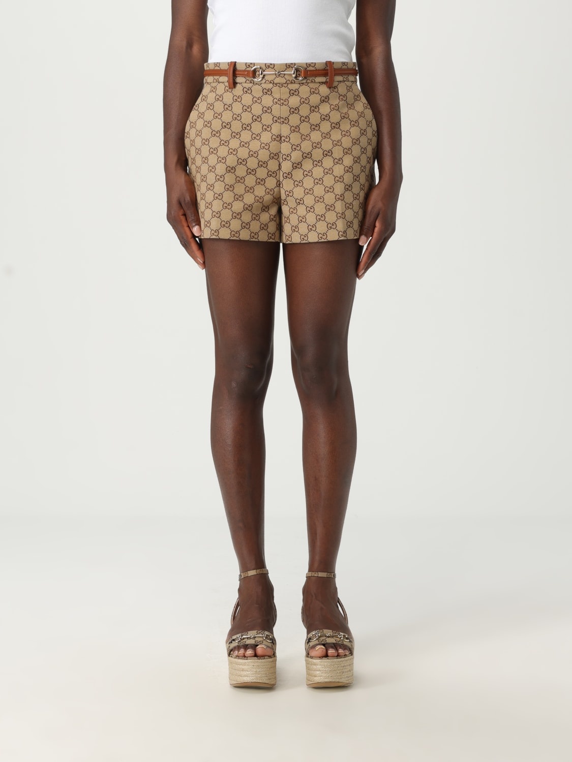 DESCRIPTION - Style: Classic - Logo: Gucci GG monogram - Length: Short - Pockets: Slit pocket - Waist: With belt, With loops, Medium waist - Bottom: With straight hemline - Materials: Cotton blend - Pattern: All-over monogram DETAILS AND CARE Composition T 70% COTTON T 30% POLYESTER SIZE AND FIT Sizes not available Size and fit Regular fit Designer code: 820468Z8BZK 2580 Giglio Code: 426299 Designer: Gucci Collection: Gucci Woman Category: Clothing Gucci