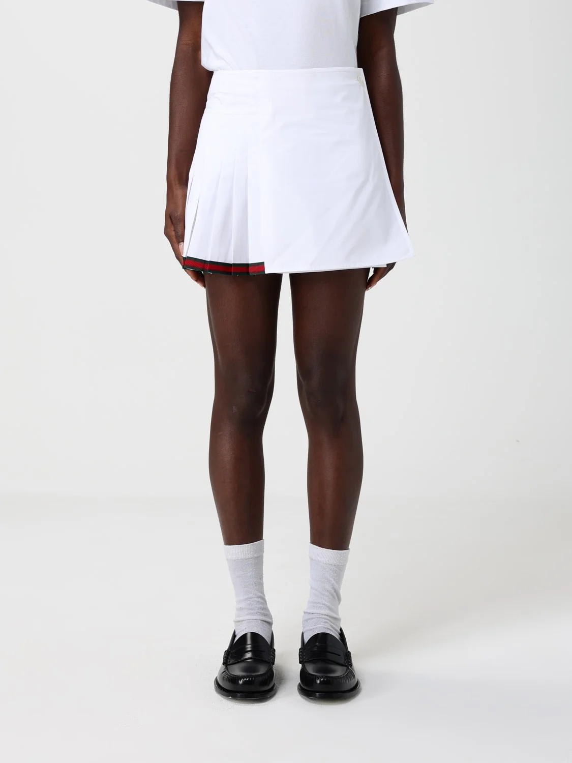 DESCRIPTION - Style: Casual - Model: Pleated - Waist: High - Bottom: With straight hemline - Closure: 1-button - Length: Mini skirt - Logo: Gucci Web - Materials: Cotton - Pattern: Plain-colored DETAILS AND CARE Composition COTTON SIZE AND FIT Sizes not available Size and fit Regular fit Designer code: 846659ZAJP1 9000 Giglio Code: 440516 Designer: Gucci Collection: Clothing Gucci Category: Clothing > Skirt