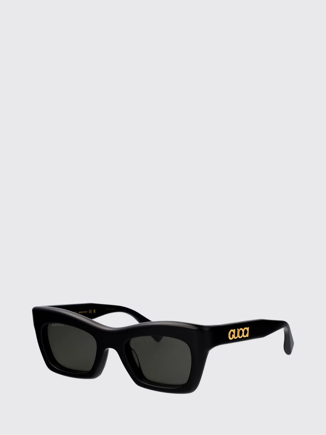 DESCRIPTION - Logo: Contrasting, Lettering - Model: Cat eye - Shape: Rectangular - Measurements: Bridge: 21, Lens width: 50 mm, Temples: 140 - Components: Dark lenses, UVA/UVB lenses - Materials: Acetate - Pattern: Logo DETAILS AND CARE Composition ACETATE SIZE AND FIT Sizes not available Designer code: GG1773S 001 Giglio Code: H01083 Designer: Gucci Collection: Gucci Woman Category: Accessories Gucci