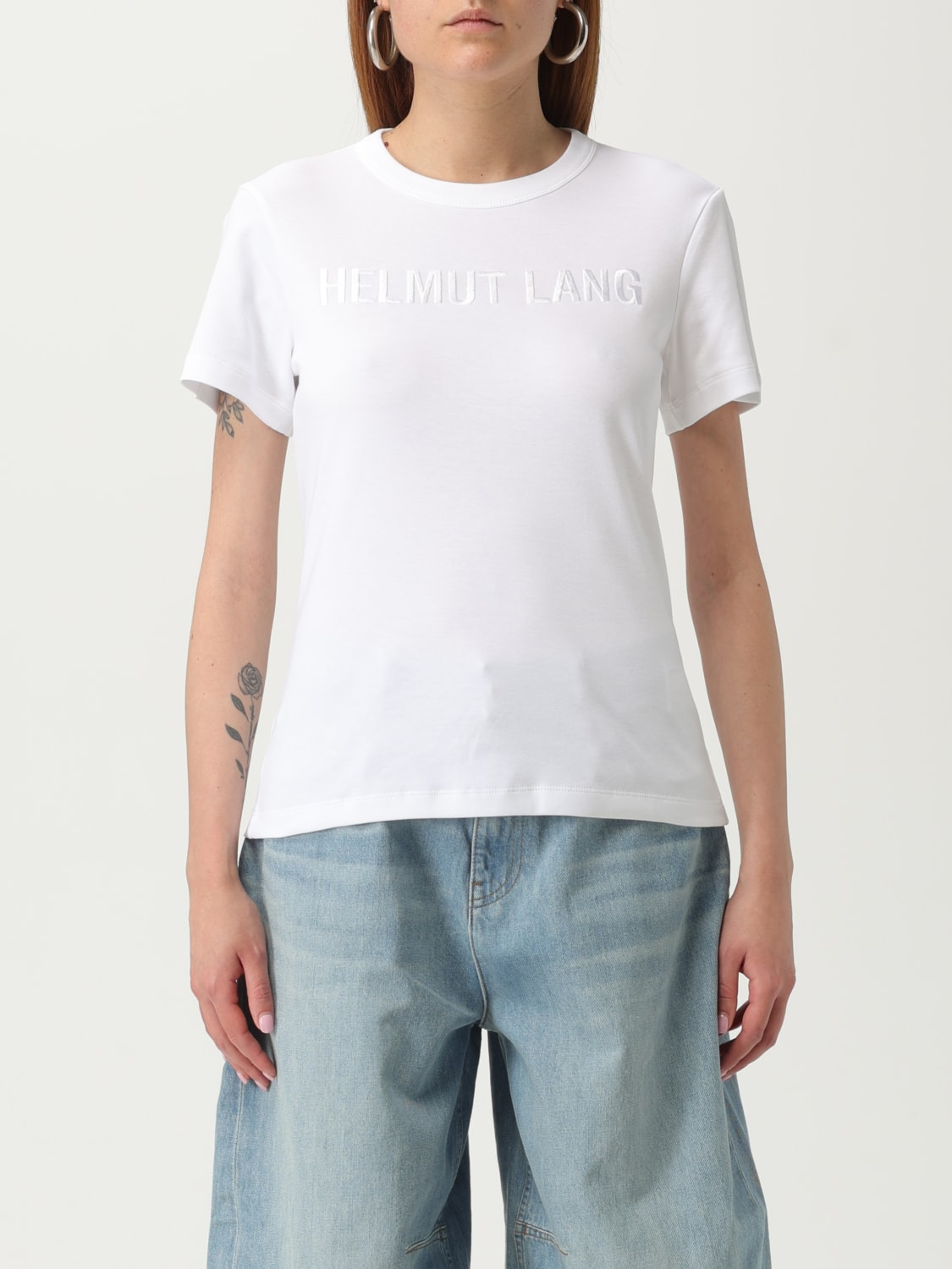 DESCRIPTION - Style: Contemporary - Logo: Tone-on-tone - Neckline: Crewneck - Shoulders: Regular - Sleeves: Short - Bottom: With straight hemline - Materials: Cotton - Pattern: Logo DETAILS AND CARE Composition 100% Cotton SIZE AND FIT Sizes not available Size and fit Slim fit Designer code: O06HW505 100 Giglio Code: G53096 Designer: Helmut Lang Collection: Helmut Lang Woman Category: Clothing Helmut Lang