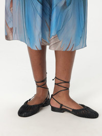 DESCRIPTION - Lining: With logo - Toe: With flowers - Ankle: With ribbon to tie - Sole: Leather - Model: Pierced - Materials: Smooth calfskin - Pattern: Plain-colored DETAILS AND CARE Composition not available SIZE AND FIT Sizes not available Designer code: MANTWFS24 BLACK Giglio Code: G59826 Designer: Hereu Collection: Hereu Woman Category: Shoes Hereu