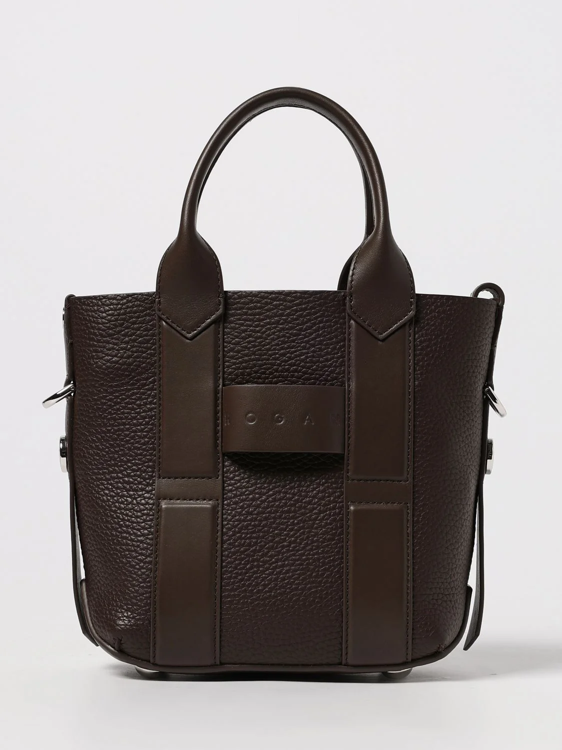 DESCRIPTION - Style: Sporty - Logo: Engraved - Model: Shoulder - Shape: Rectangular - Handle: Leather - Shoulder strap: Adjustable and removable - Materials: Hammered leather - Pattern: Plain-colored DETAILS AND CARE Composition CALFSKIN SIZE AND FIT Sizes Width : 20 cm Height: 21 cm Depth: 9 cm Designer code: KBW01OA0100UH9 S610 Giglio Code: 437466 Designer: Hogan Collection: Hogan Woman Category: Bags Hogan