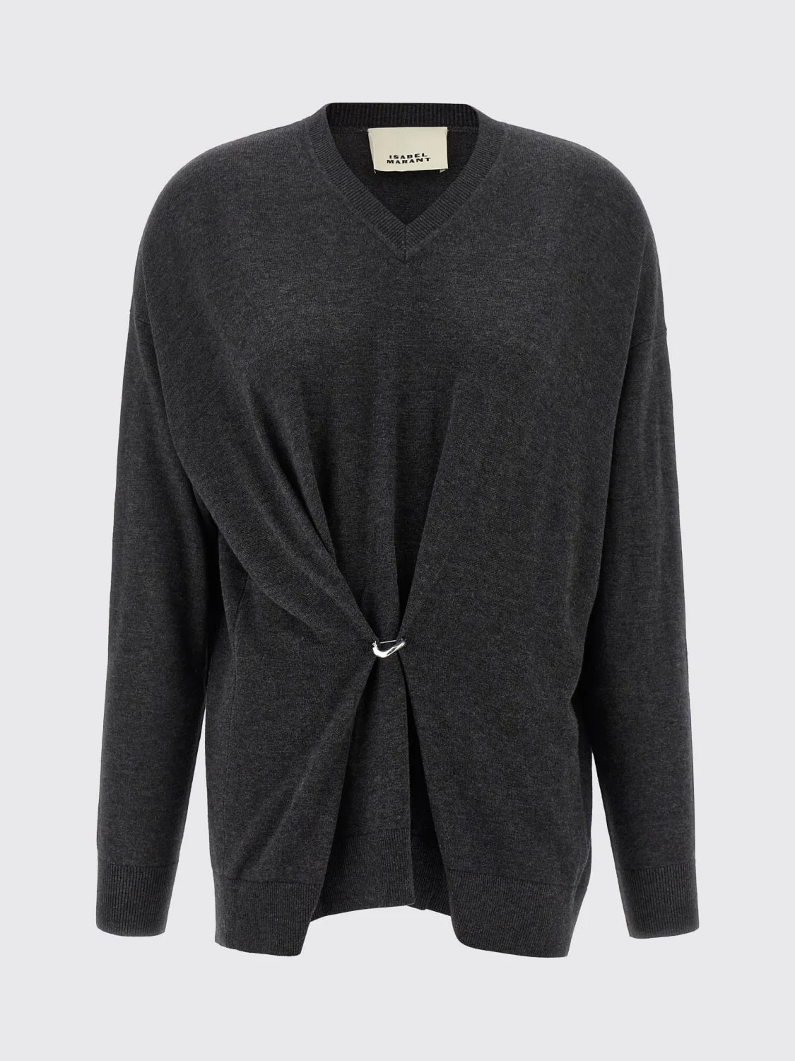 DESCRIPTION - Style: Casual, Classic - Neckline: V neckline - Shoulders: Relaxed - Sleeves: Long - Cuffs: Ribbed - Bottom: With ribbed edges - Details: With metallic ring - Materials: Wool blend - Pattern: Plain-colored DETAILS AND CARE Composition 70% viscose, 30% wool SIZE AND FIT Sizes not available Size and fit Regular fit Designer code: PU0717FAB1L05I 02AN Giglio Code: H48998 Designer: Isabel Marant Collection: Clothing Isabel Marant Category: Clothing > Sweater