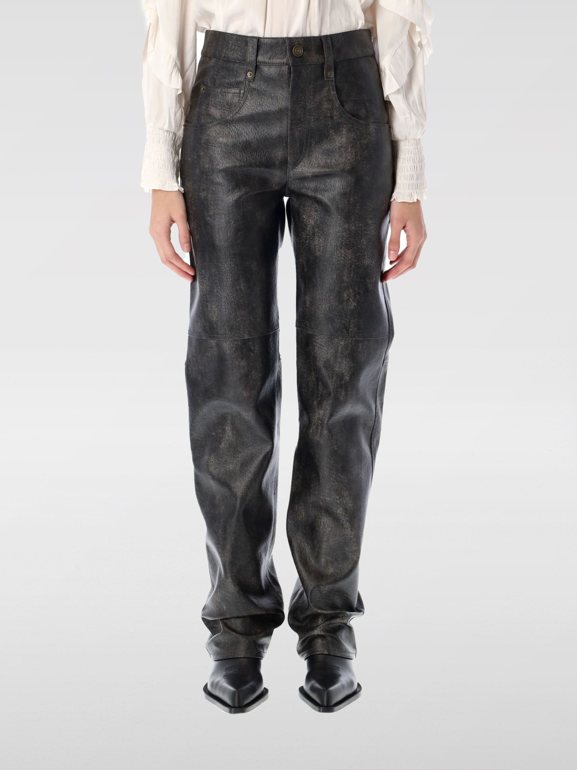 DESCRIPTION - Style: Urban-street - Pockets: 5-pocket - Waist: High waist - Bottom: With straight hemline - Closure: With button and zip - Materials: Synthetic leather - Pattern: Plain-colored DETAILS AND CARE Composition 100% polyurethane Lining 100% cotton SIZE AND FIT Sizes not available Size and fit Regular fit Designer code: PA0519FAC1B01E 02FK Giglio Code: G58615 Designer: Isabel Marant Etoile Collection: Isabel Marant Etoile Woman Category: Clothing Isabel Marant Etoile