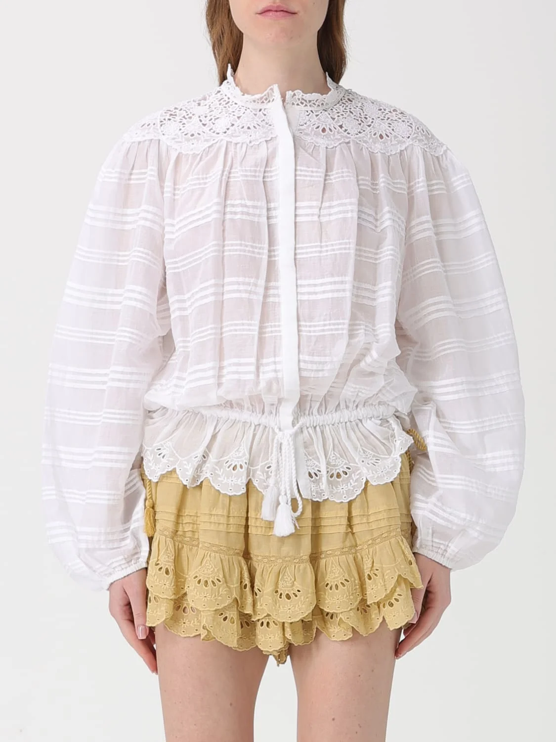 DESCRIPTION - Style: Bohemien, Romantic - Neckline: Crewneck - Shoulders: Regular - Sleeves: Long sleeve shirts - Closure: Concealed, With buttons - Bottom: With straight hemline - Details: With macrame details - Materials: Cotton - Pattern: Embroidery, Plain-colored DETAILS AND CARE Composition not available SIZE AND FIT Sizes not available Size and fit Regular fit Designer code: HT0767FAD1J05E 20WH Giglio Code: H81647 Designer: Isabel Marant Etoile Collection: Isabel Marant Etoile Woman Category: Clothing Isabel Marant Etoile
