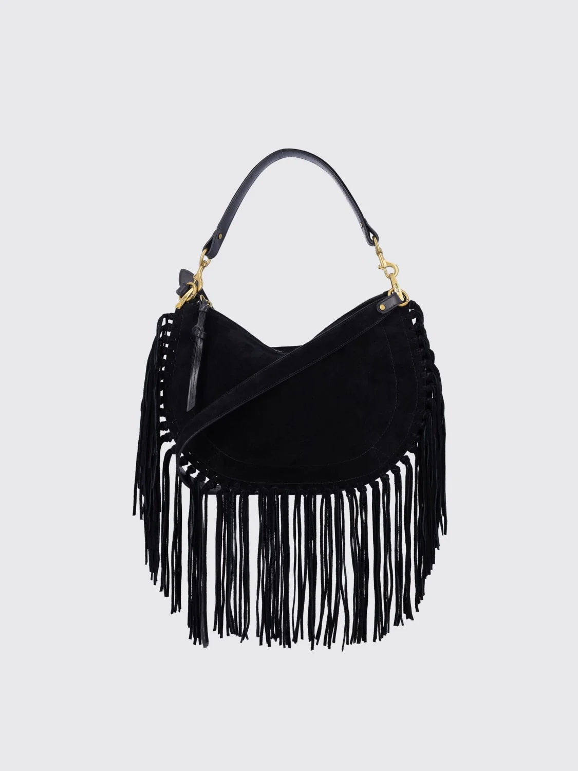 DESCRIPTION - Logo: Lettering - Details: With fringes - Model: Shoulder - Closure: With zip - Handle: Removable - Shoulder strap: Adjustable and removable - Shape: Round - Materials: Suede calfskin - Pattern: Plain-colored DETAILS AND CARE Composition 100% suede calf leather SIZE AND FIT Sizes Width : 34 cm Height: 23 cm Depth: 6 cm Designer code: BF0066FCC3C14M 01BK Giglio Code: H22749 Designer: Isabel Marant Collection: Isabel Marant Woman Category: Bags Isabel Marant