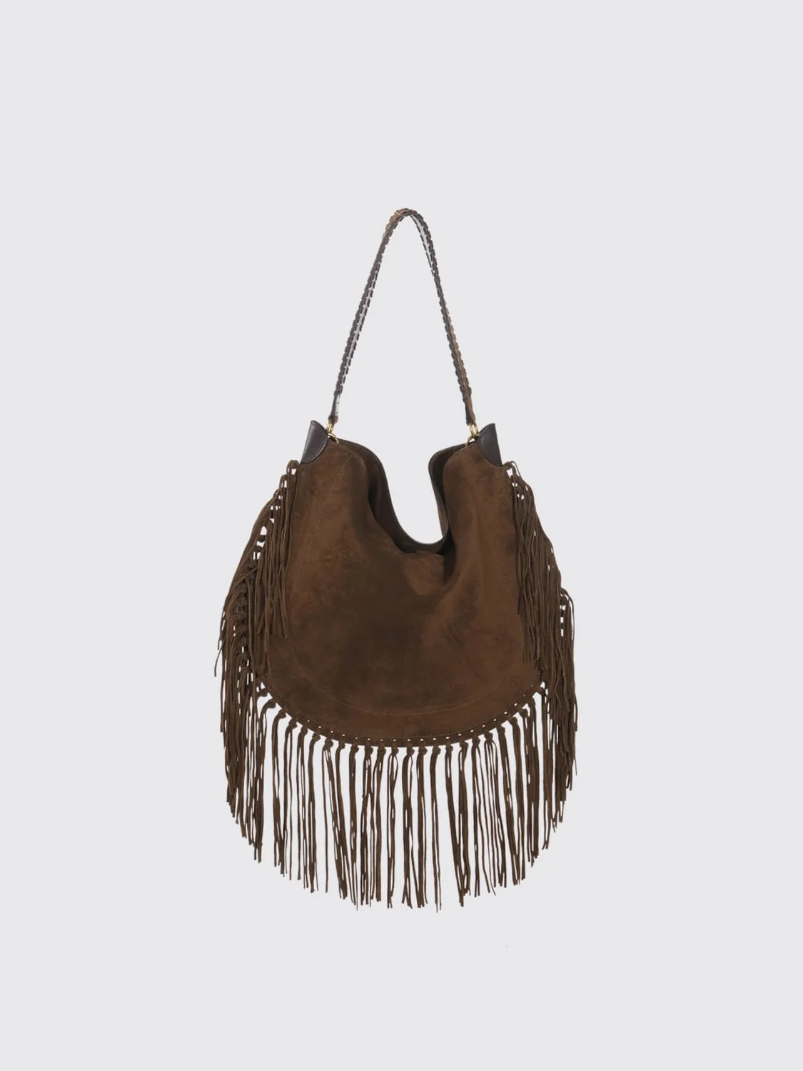 DESCRIPTION - Logo: Engraved - Details: With fringes - Lining: Cotton - Model: Shoulder - Closure: Magnetic - Shape: Round - Handle: Leather - Materials: Suede calfskin - Pattern: undefined DETAILS AND CARE Composition not available SIZE AND FIT Sizes Width : 43,5 cm Height: 38,5 cm Designer code: PP0200FCC3C14M 50BZ Giglio Code: H16302 Designer: Isabel Marant Collection: Isabel Marant Woman Category: Bags Isabel Marant