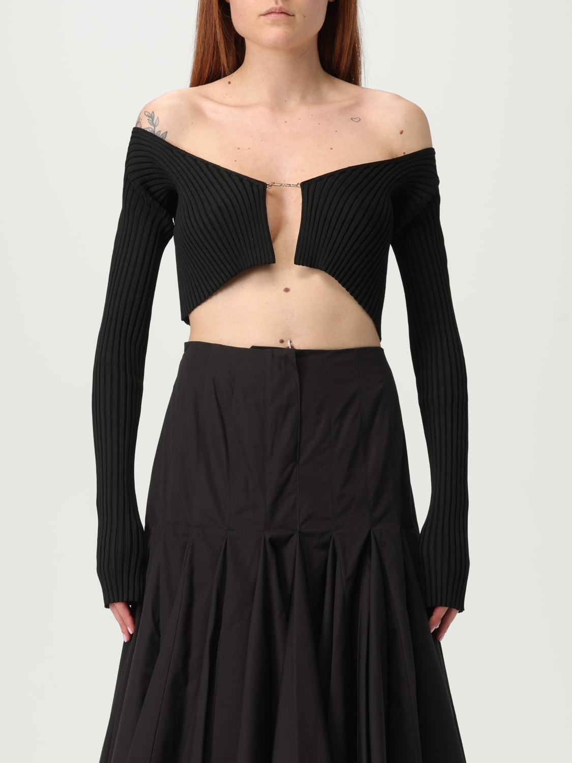DESCRIPTION - Style: Contemporary - Logo: Metallic - Neckline: V neckline - Sleeves: Long - Cuffs: Ribbed - Bottom: With straight hemline - Model: Ribbed - Materials: Viscose blend - Pattern: Plain-colored DETAILS AND CARE Composition 81% viscose 12% polyamide 4% elastane 3% poly SIZE AND FIT Sizes not available Size and fit Cropped fita Designer code: KN1082190 990 Giglio Code: G70698 Designer: Jacquemus Collection: Jacquemus Woman Category: Clothing Jacquemus