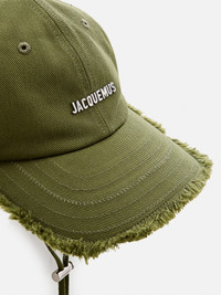 DESCRIPTION - Logo: Metallic - Model: Baseball - Bottom: Fringed - Components: Rigid visor - Closure: With adjustable strap - Details: With adjustable drawstrings - Materials: Cotton - Pattern: Logo DETAILS AND CARE Composition 100% COTTON SIZE AND FIT Sizes not available Designer code: ACU00452AW00092 560 Giglio Code: H19427 Designer: Jacquemus Collection: Jacquemus Woman Category: Accessories Jacquemus