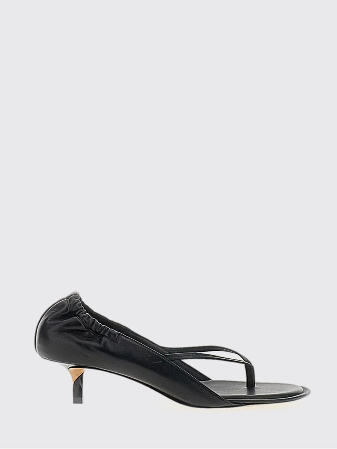 DESCRIPTION - Style: Minimal - Lining: Leather, With logo - Model: Flip flops - Toe: Open, Round - Sole: Leather - Heel: With stretch strap , Tacco medio a stiletto - Occasion: Morning - Materials: Smooth lambskin - Pattern: Plain-colored DETAILS AND CARE Composition 100% lamb leather (Ovis aries) SIZE AND FIT Sizes not available Designer code: 26EFOW00204AC27L26 990 Giglio Code: I21005 Designer: Jacquemus Collection: Shoes Jacquemus Category: Shoes > Heeled sandal