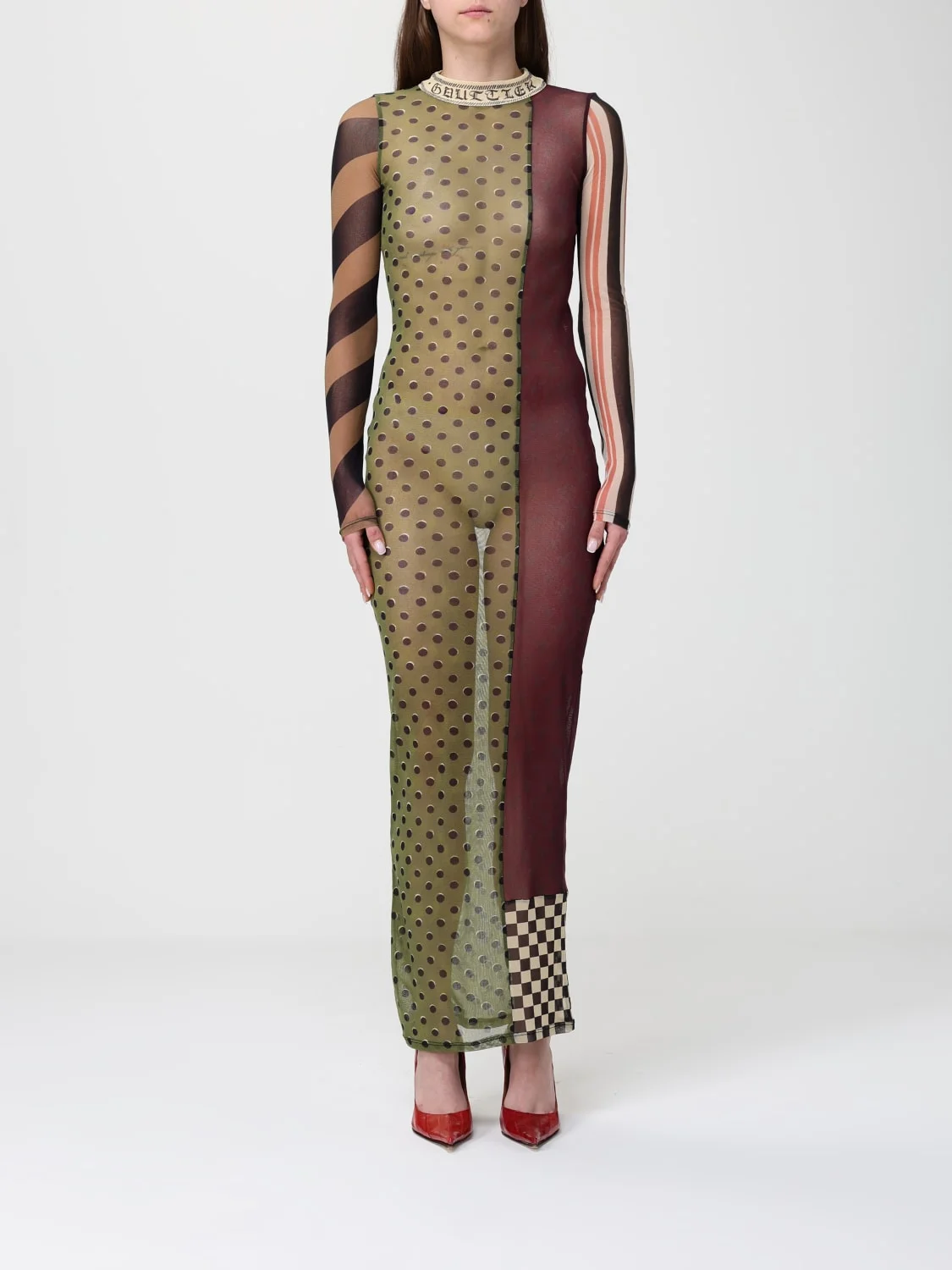 DESCRIPTION - Style: Safari - Model: Sheath - Neckline: Crewneck - Shoulders: Regular - Bottom: With straight hemline - Length: Long dresses - Occasion: Evening and party dresses - Sleeves: Long sleeve dresses - Materials: Stretch technical fabric - Pattern: Polka dots, Stripes DETAILS AND CARE Composition not available SIZE AND FIT Sizes not available Size and fit Slim fit Designer code: 2601WDR115M015P 90 Giglio Code: H99067 Designer: Jean Paul Gaultier Collection: Jean Paul Gaultier Woman Category: Clothing Jean Paul Gaultier