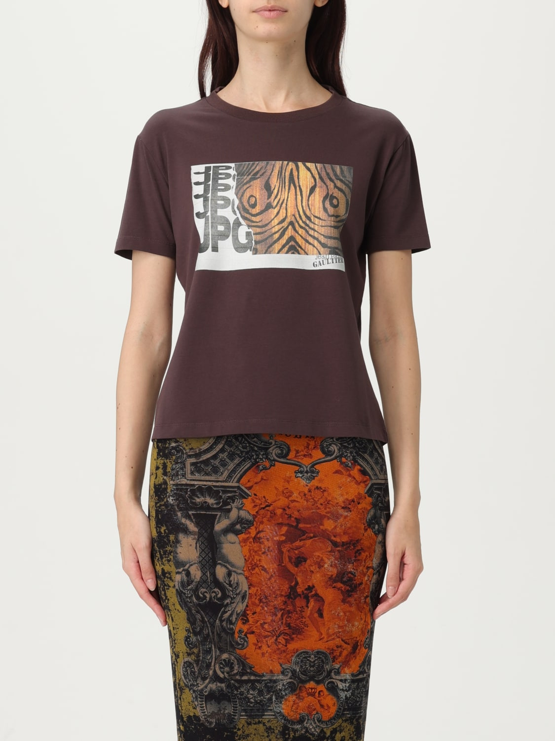 DESCRIPTION - Style: Safari - Logo: Contrasting - Model: Crewneck - Neckline: Crewneck - Shoulders: Regular - Sleeves: Short - Bottom: With straight hemline - Materials: Organic cotton - Pattern: Graphic DETAILS AND CARE Composition 96% ORGANIC COTTON 4% ELASTANE SIZE AND FIT Sizes not available Size and fit Slim fit Designer code: 2503WTO294J002 710060 Giglio Code: H17333 Designer: Jean Paul Gaultier Collection: Jean Paul Gaultier Woman Category: Clothing Jean Paul Gaultier