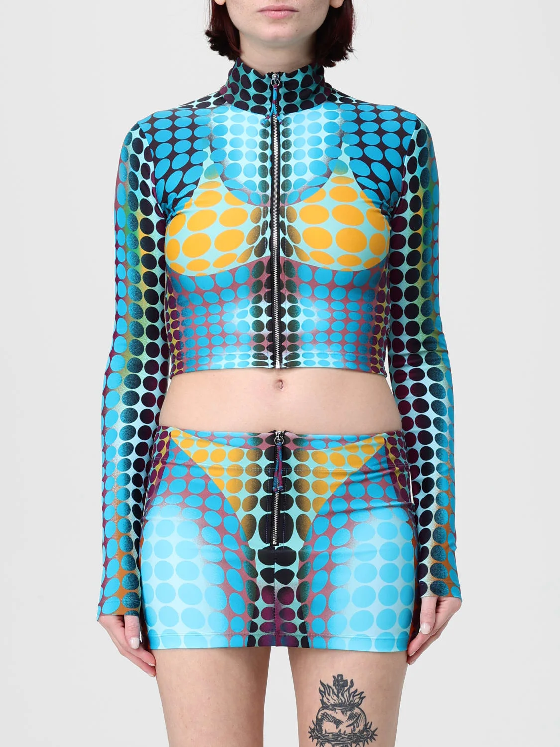 Re-edition: Cropped Zip-up Long Sleeve Top Blue Dots Print