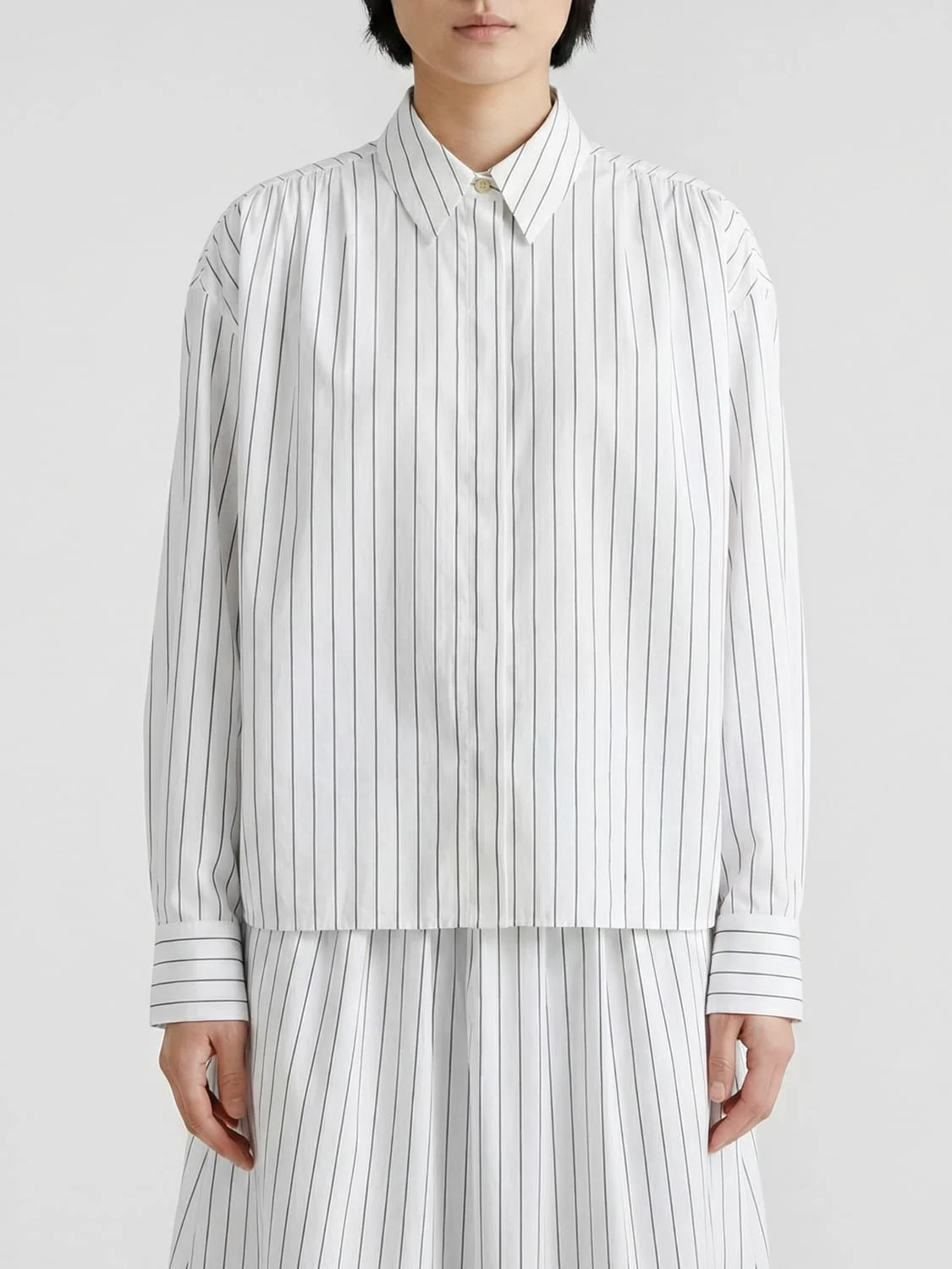 DESCRIPTION - Style: Formal - Neck: French - Shoulders: Relaxed - Closure: Concealed, With buttons - Bottom: With curved hemline - Sleeves: Long sleeve shirts - Materials: Cotton - Pattern: Stripes DETAILS AND CARE Composition _100%CO SIZE AND FIT Sizes not available Size and fit Regular fit Designer code: J02DL0281J45329 154 Giglio Code: H93075 Designer: Jil Sander Collection: Jil Sander Woman Category: Clothing Jil Sander